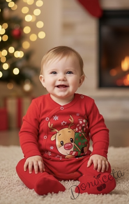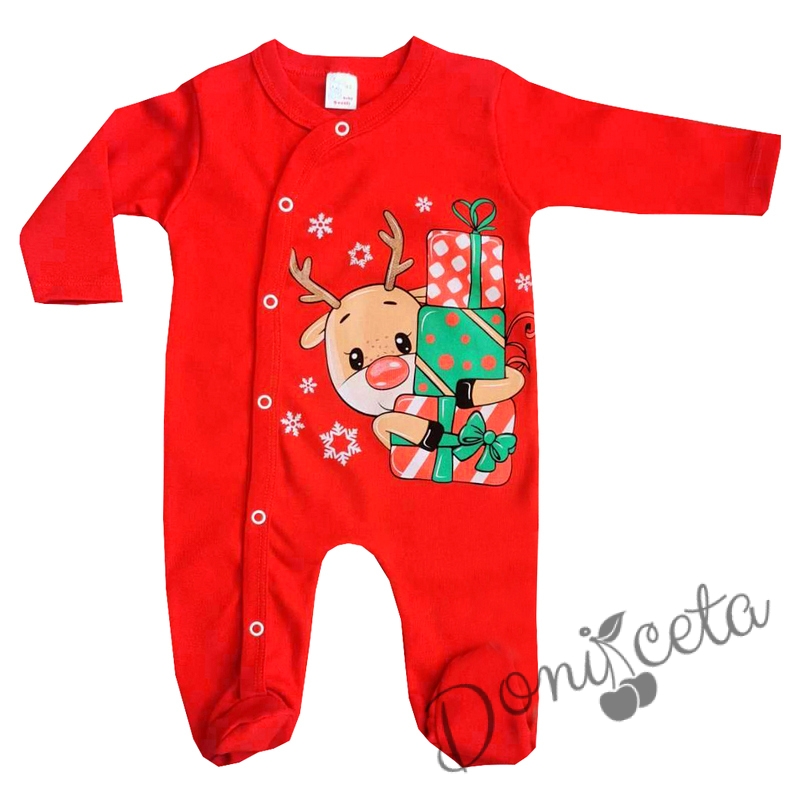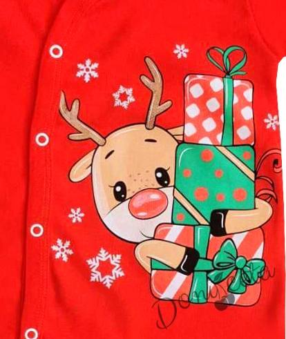 Коледен бебешки гащеризон в червено с еленче с подарък