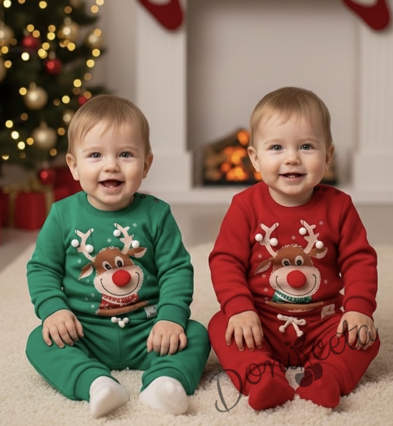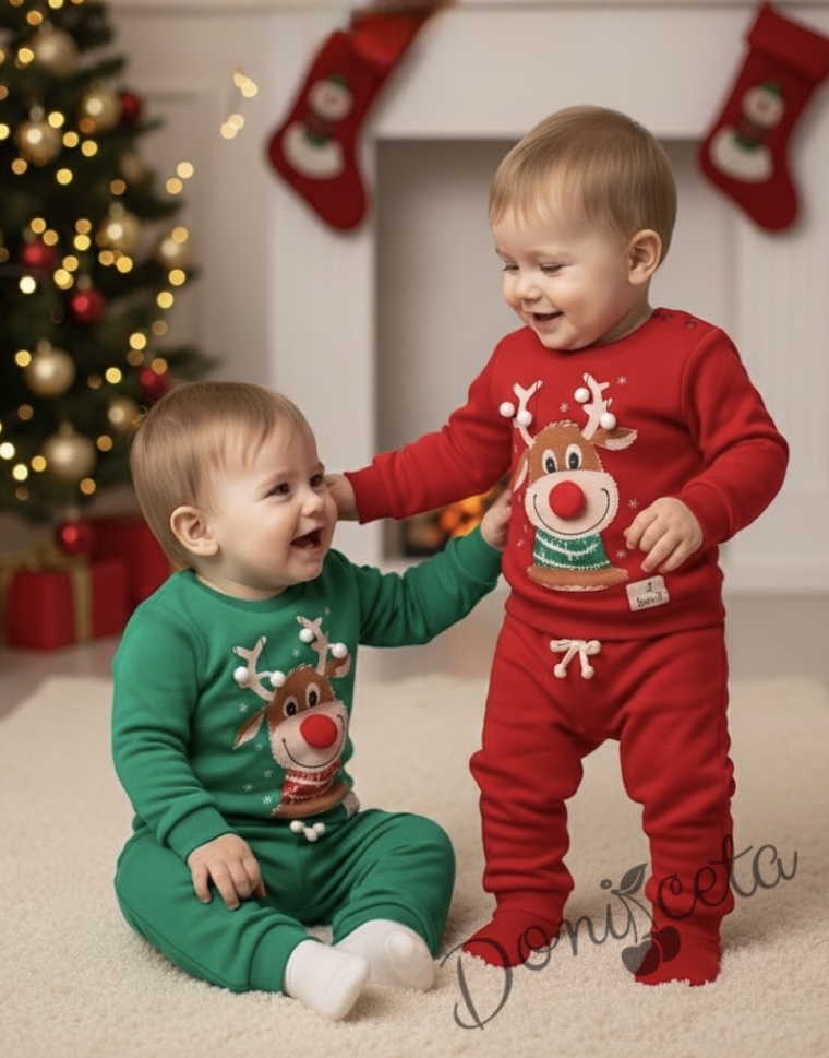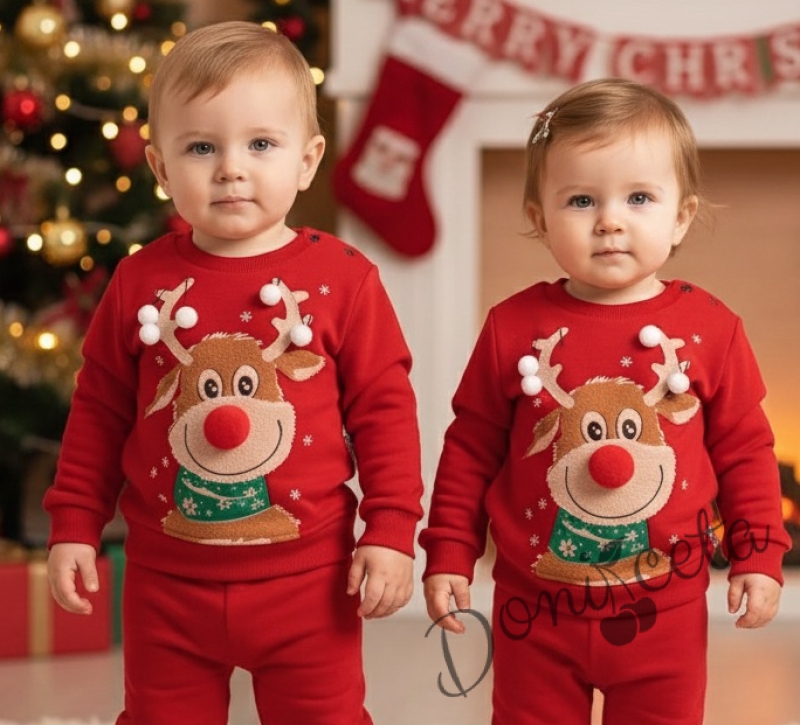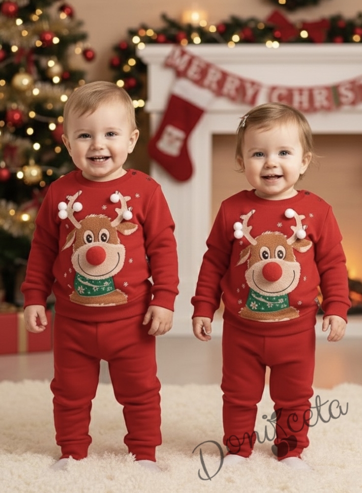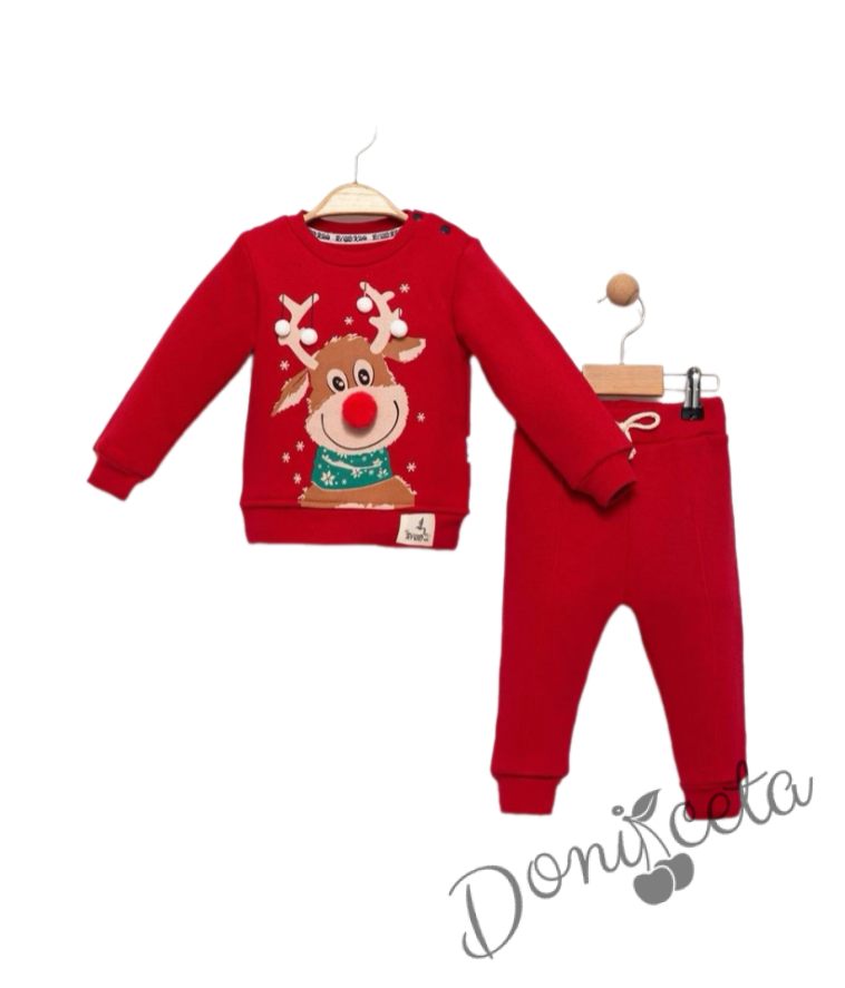 Ватиран коледен детски комплект от блуза и панталон в червено с 3D еленче