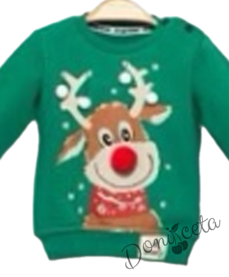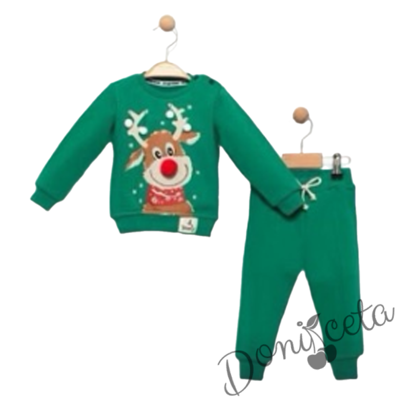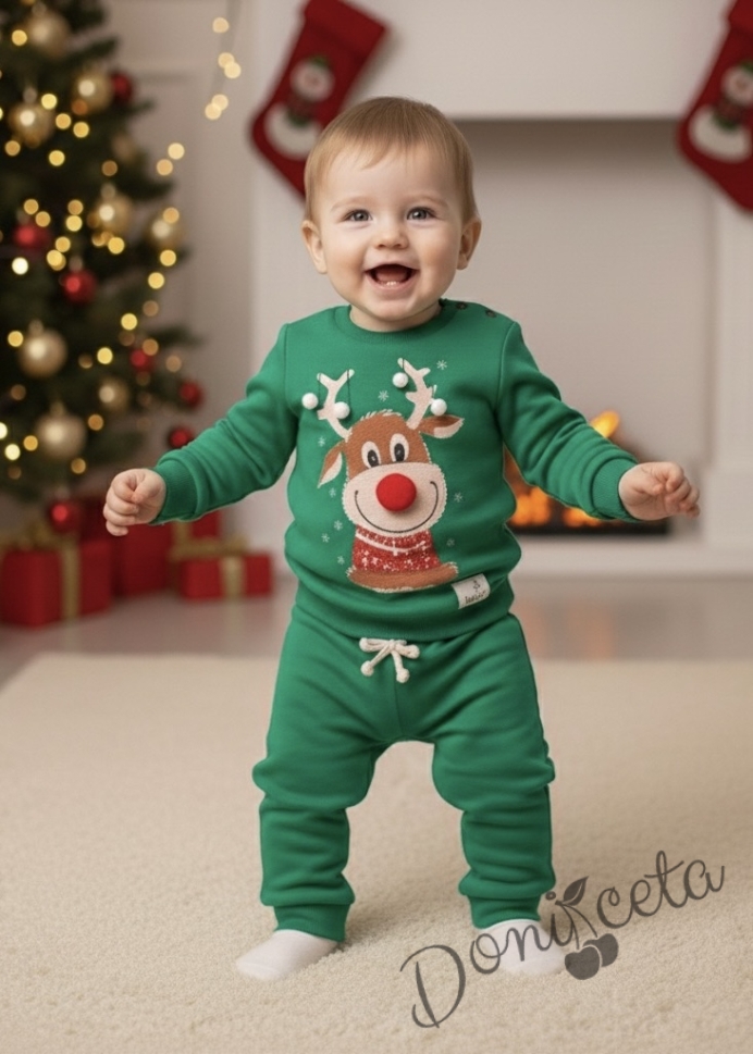 Бебешки ватиран коледен комплект от блуза и панталон в зелено с 3D еленче