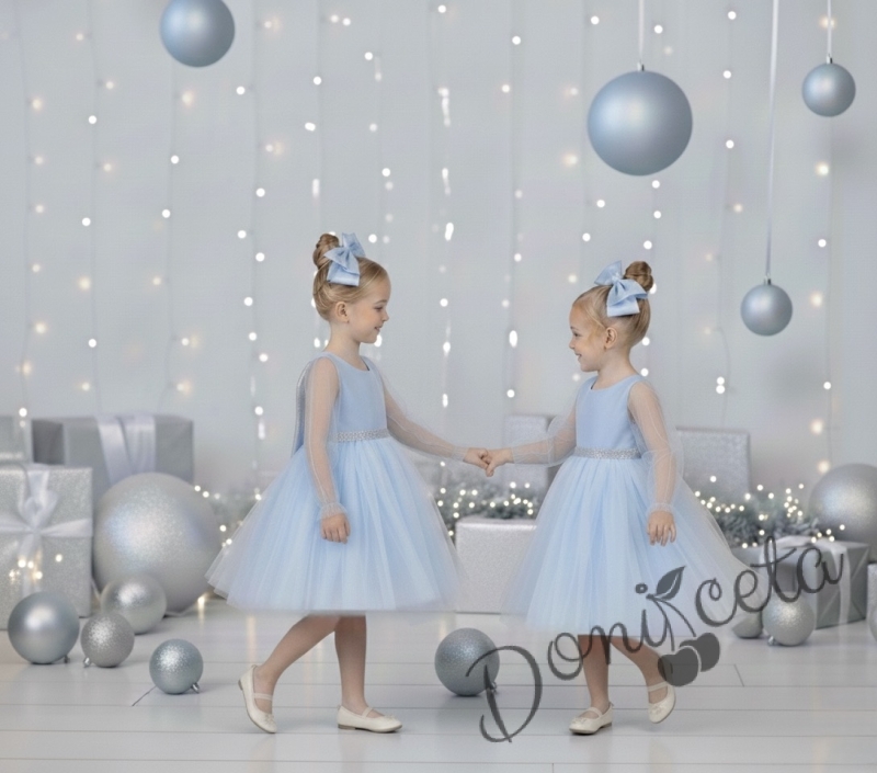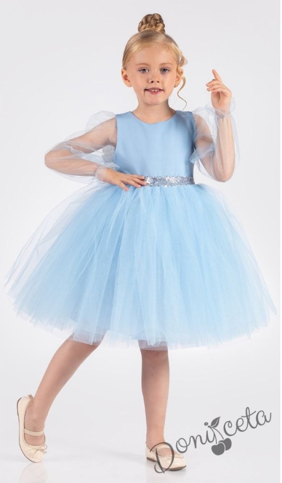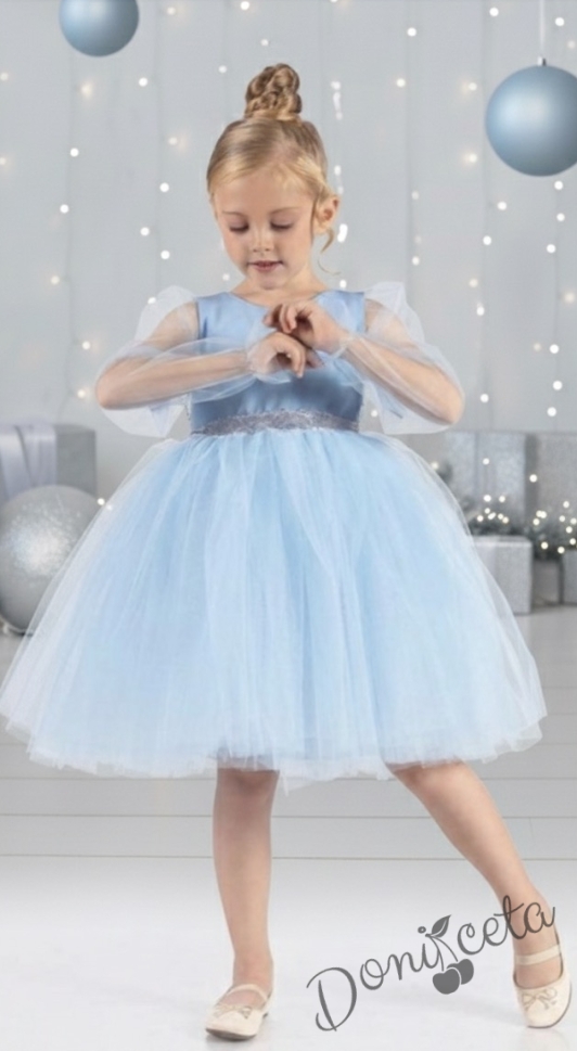 - Разкошна детска рокля в синьо с дълъг ръкав от тюл.