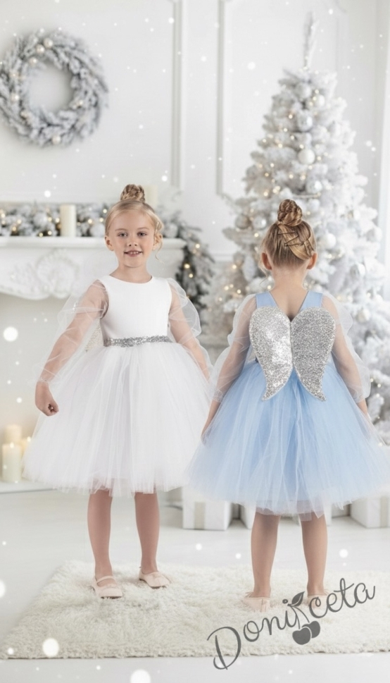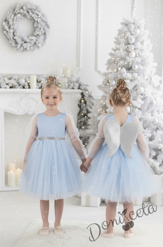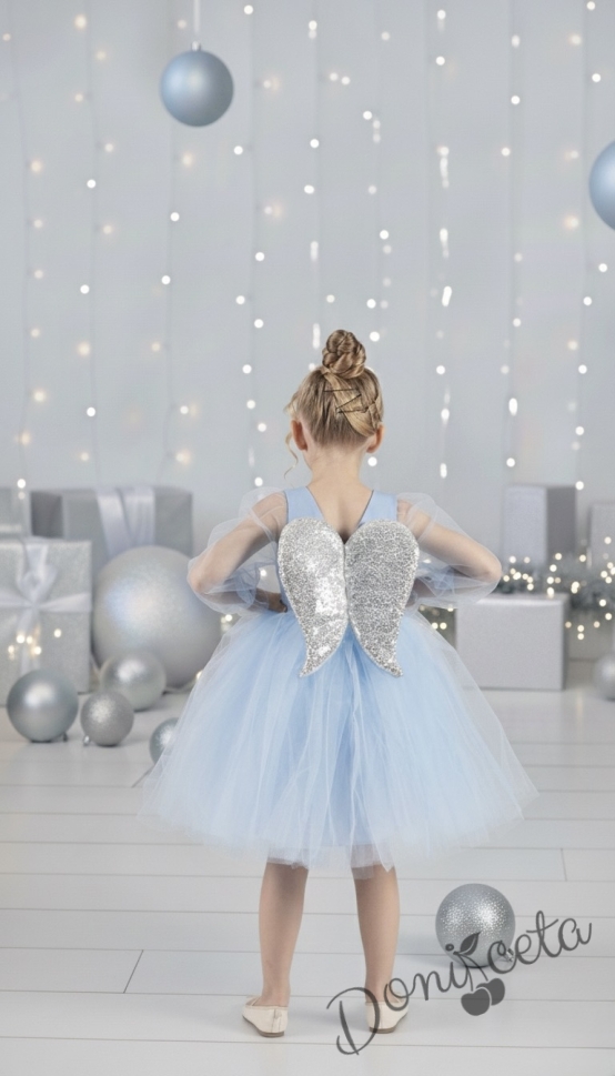 Официална детска рокля Рангелина с дълъг прозрачен ръкав в синьо с ангелски крила