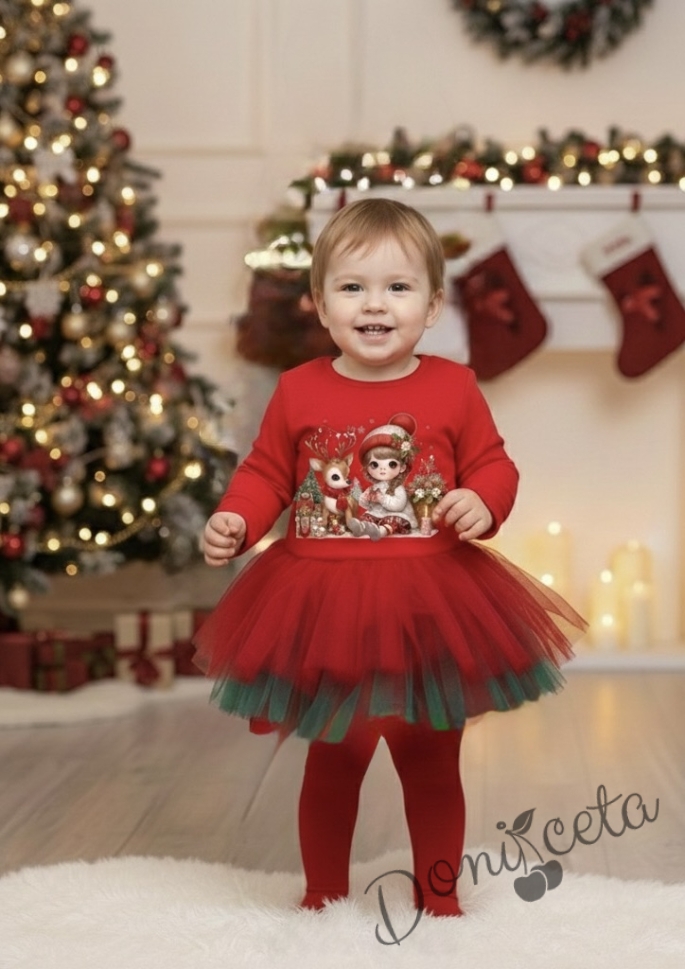 Ватирана коледна рокля в червено с коледна картинка с момиченце и сърничка и тюл в червено и зелено