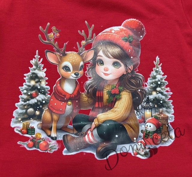 Коледна леко ватирана блуза за момиче в червено с дълъг ръкав с Дядо Коледа и еленче