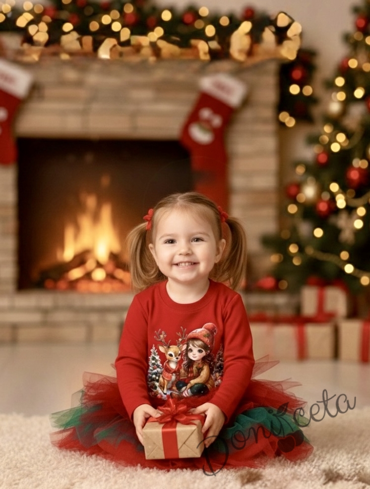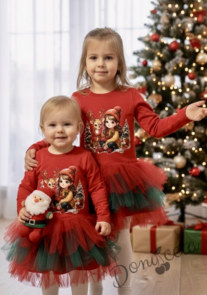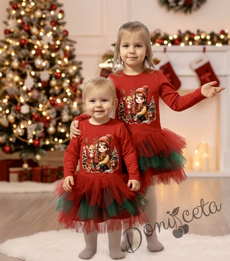 Коледна детска рокля с тюл в червено и еленче