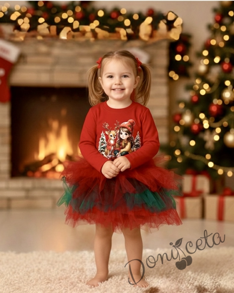 - Коледна ватирана детска рокля с коледна картинкас еленче и момиченце и цветен тюл в червено и зелено.