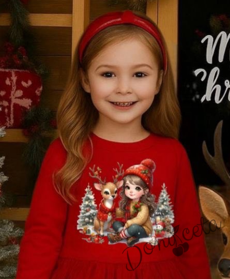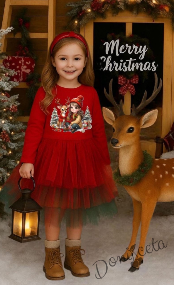 Ватирана коледна рокля в червено с коледна картинка с момиченце и сърничка и тюл в червено и зелено