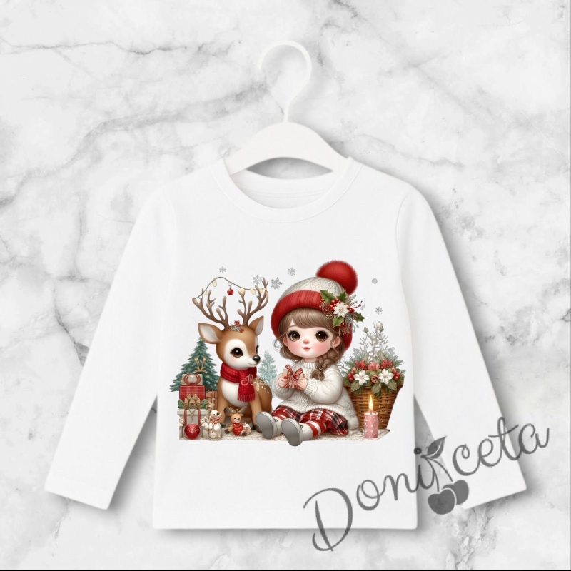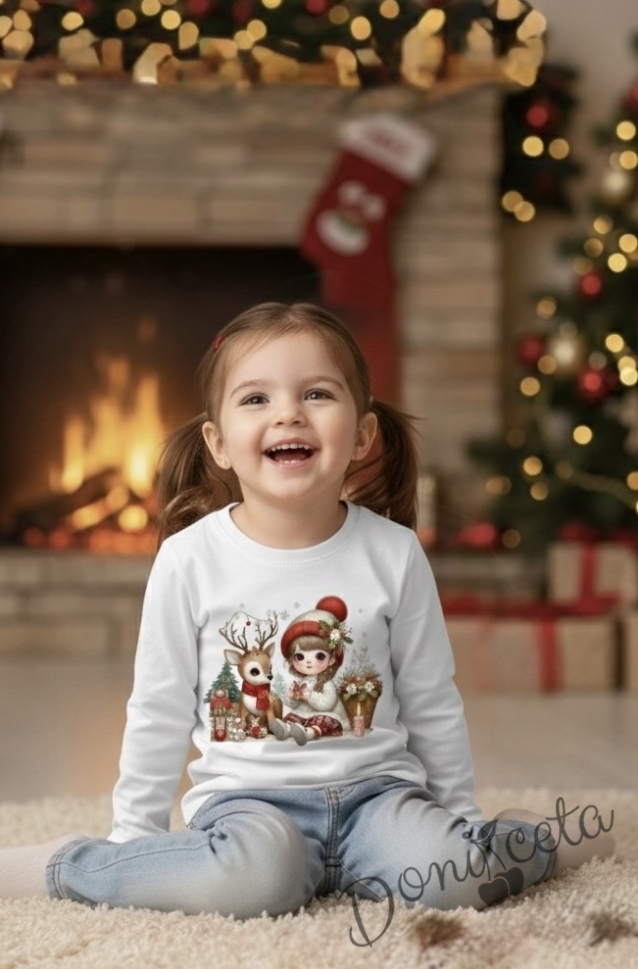 Детска коледна блуза в бяло с момиченце и весело еленче