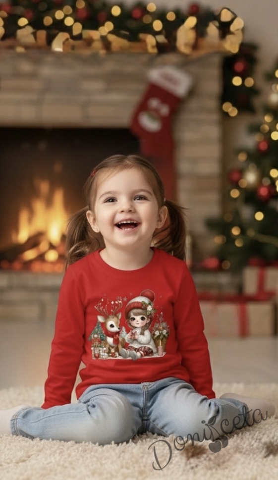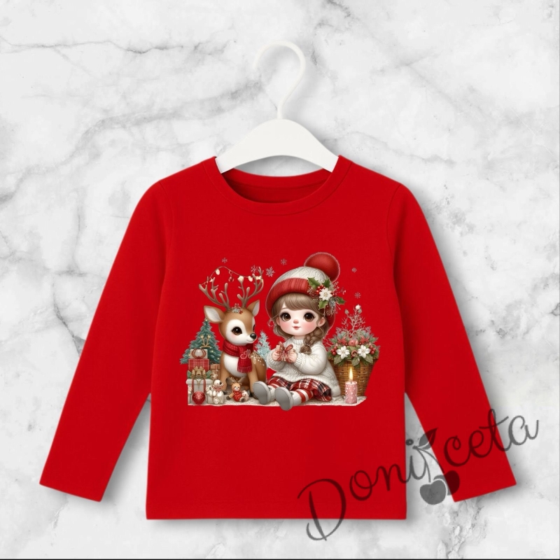Детска/бебешка ватирана коледна блузка в червено с еленче с шалче