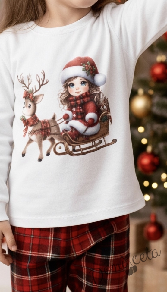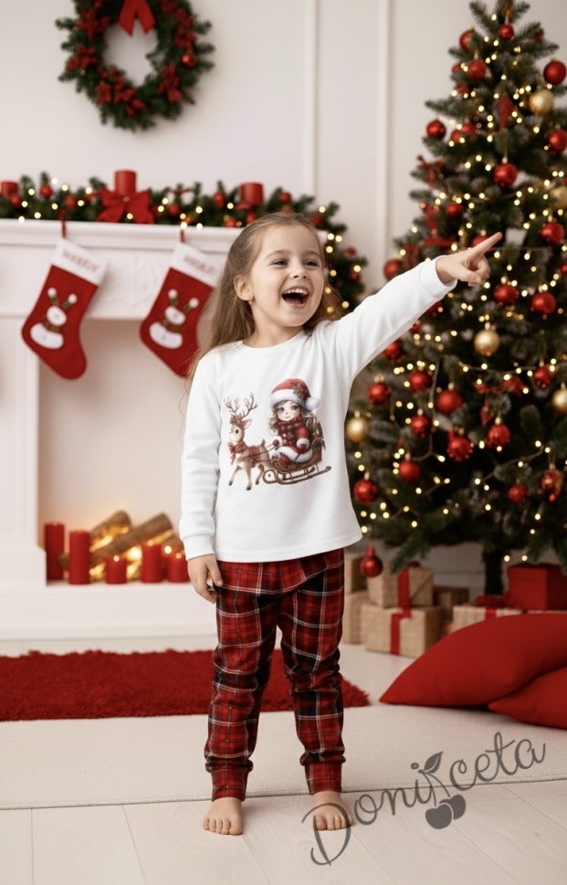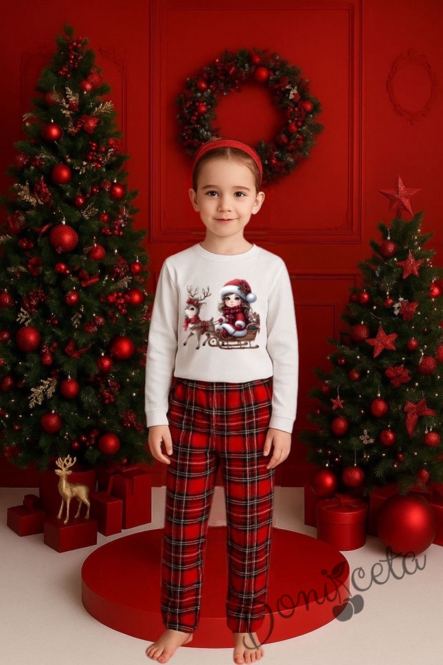 Коледна детска пижама Донър с горнище в бяло с коледна картинка и долнище в червено каре Карена