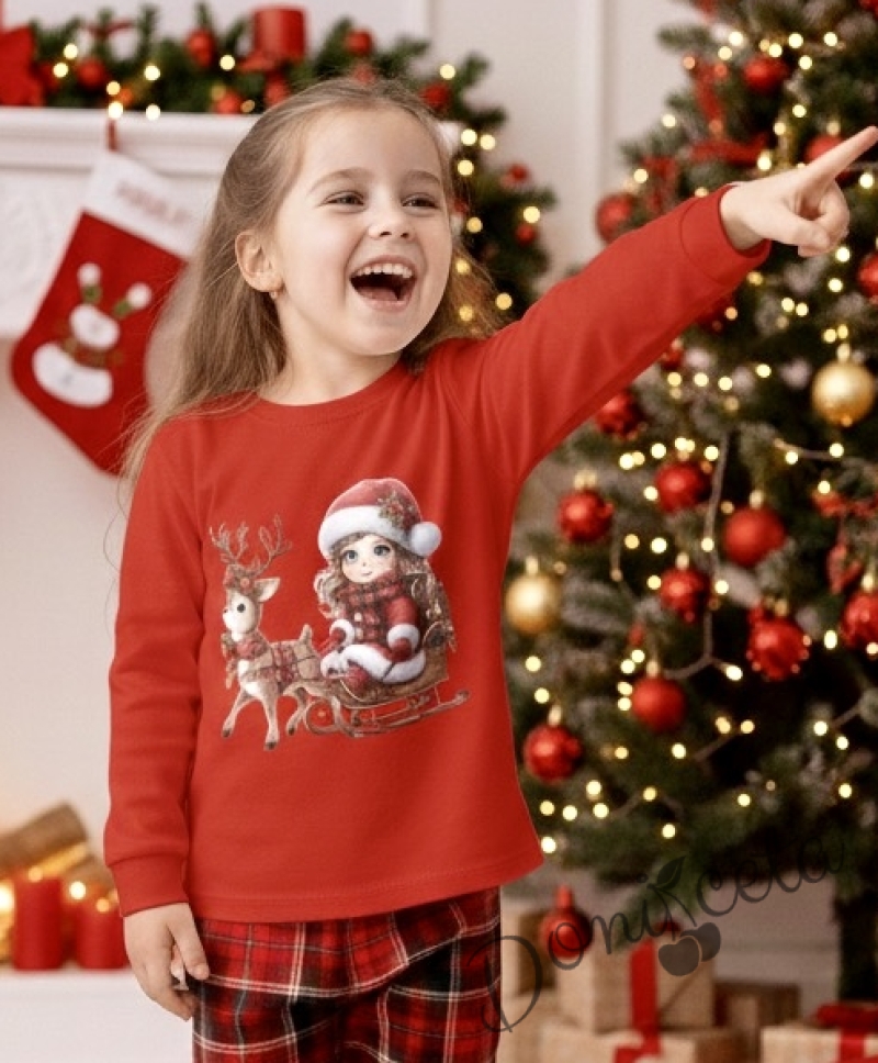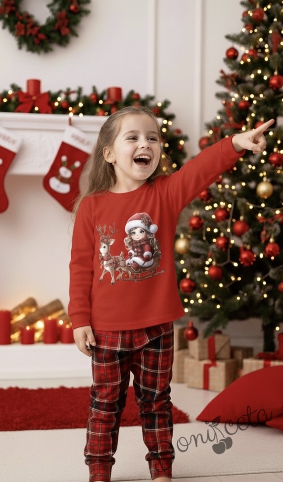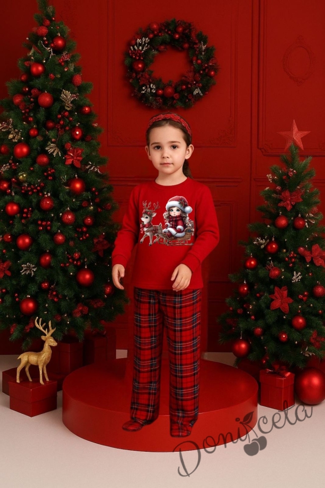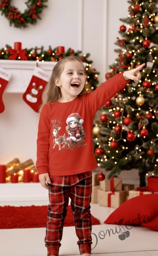 Коледна детска пижама Донър с горнище в червено с коледна картинка и долнище в червено каре Карена