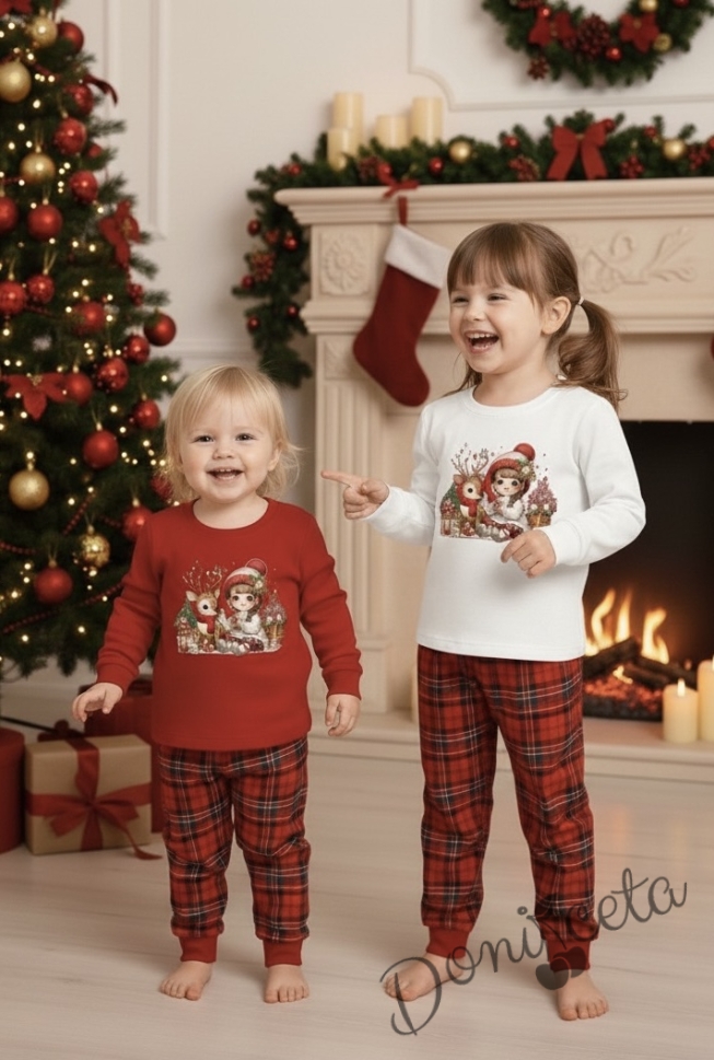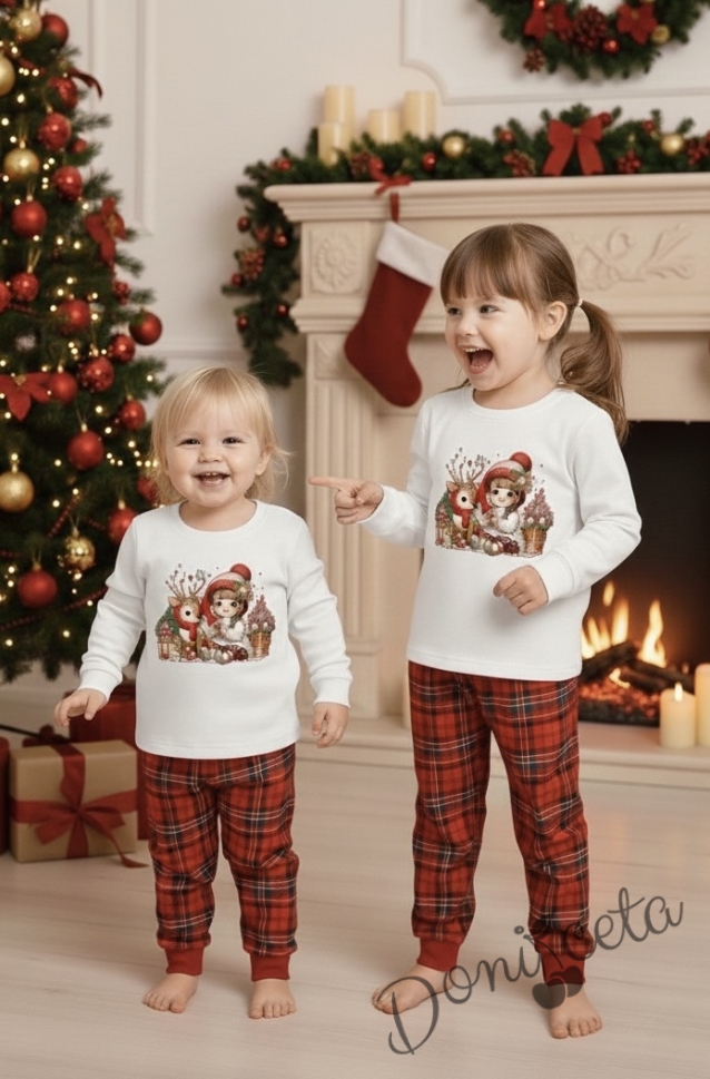 Коледна детска пижама Донър с горнище в бяло с коледни мотиви и долнище в червено каре Карена