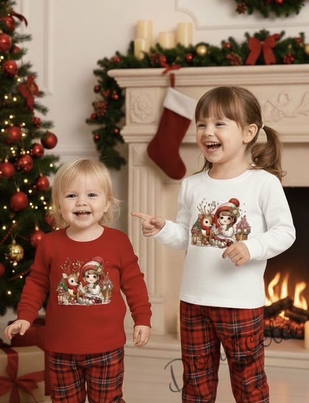 Коледна детска пижама Донър с горнище в червено с коледни мотиви и долнище в червено каре Карена