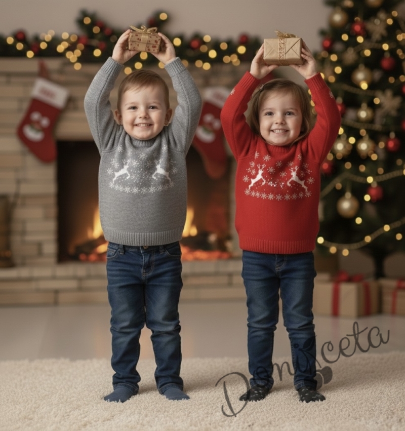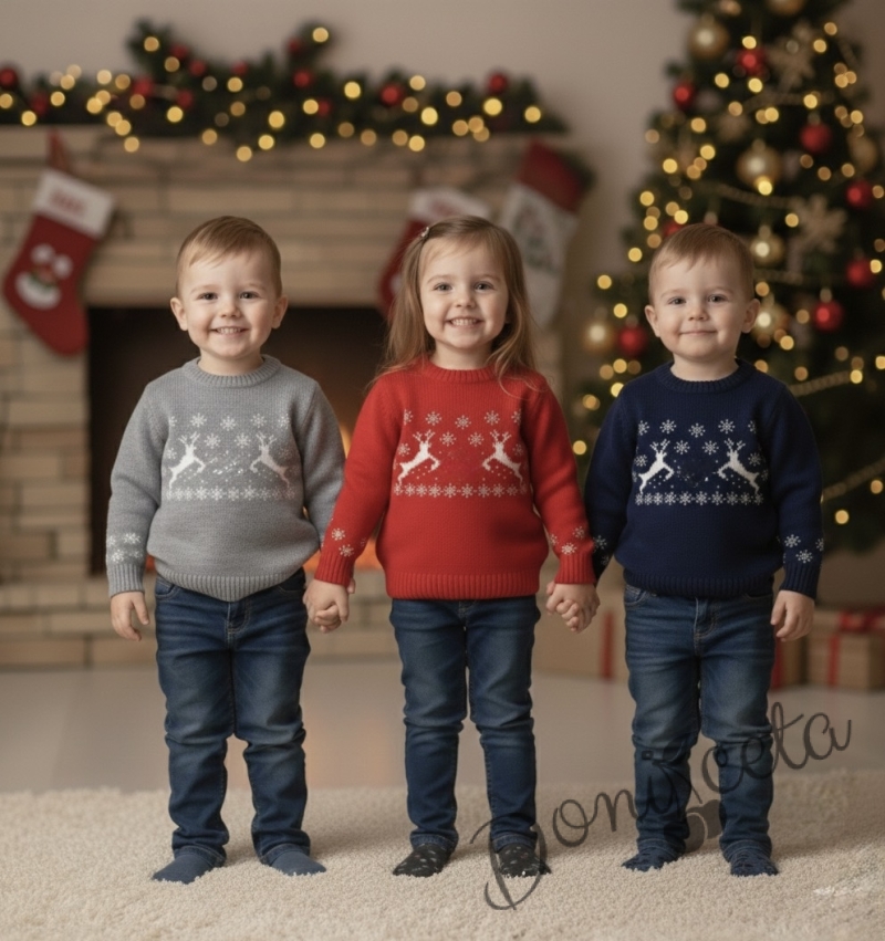 Детски коледен суитшърт в червено със снежен човек и Дядо Коледа