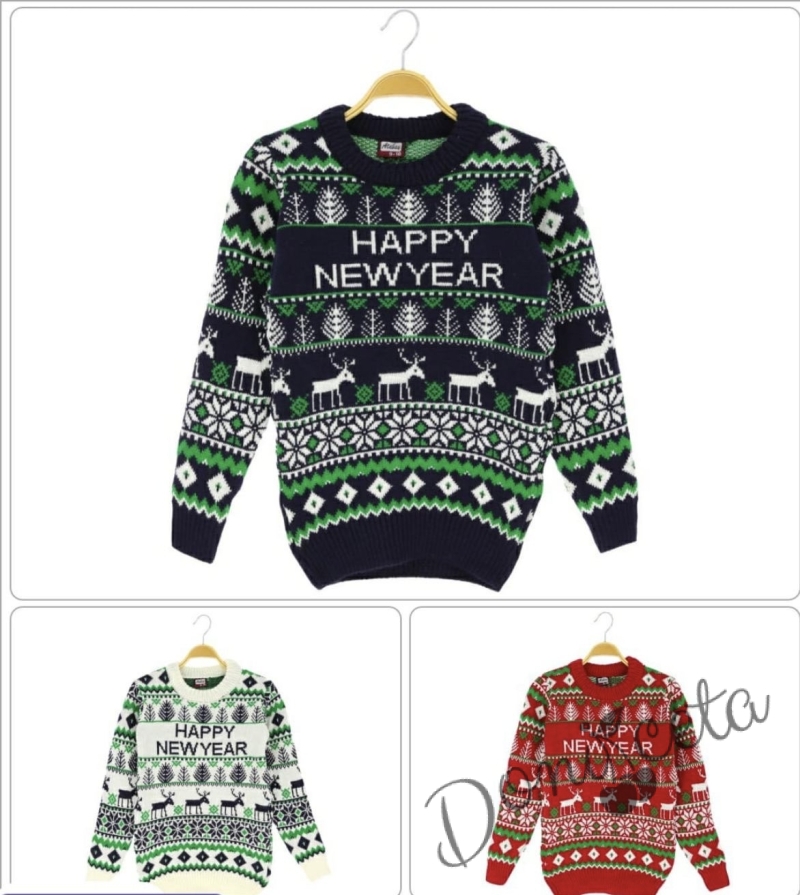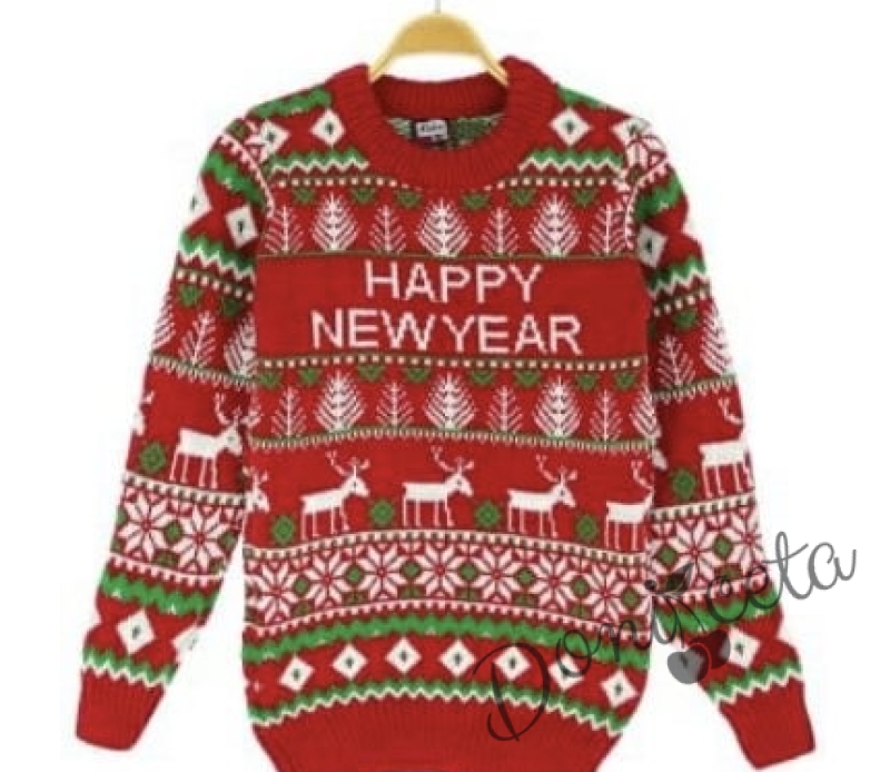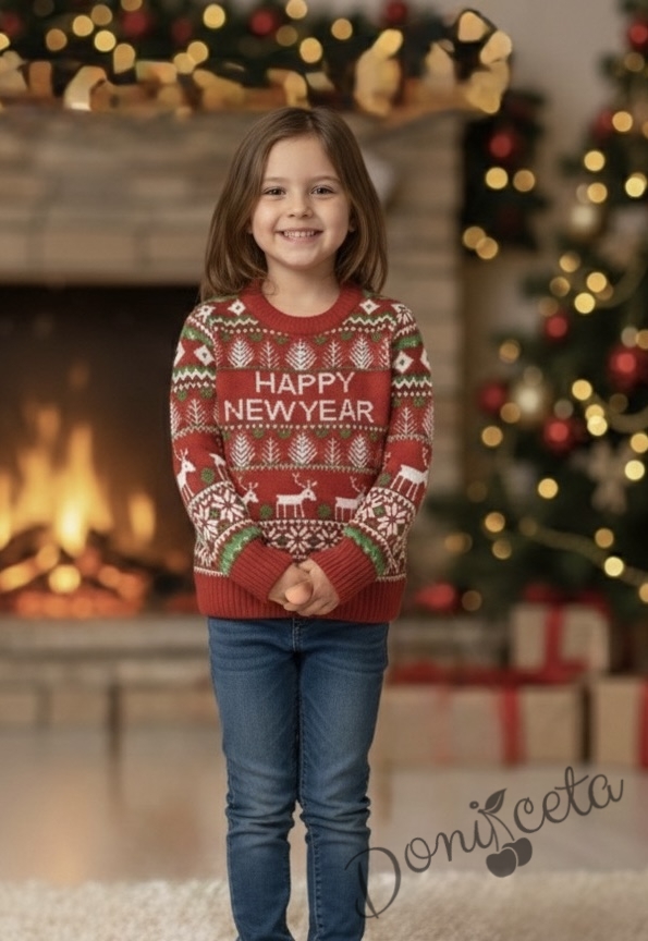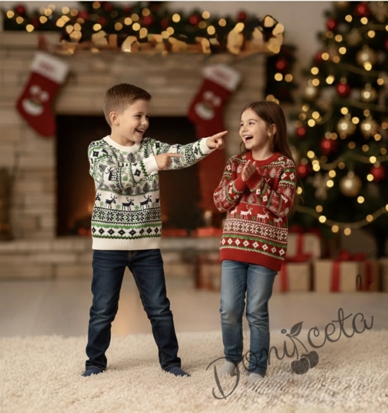 - Детски коледен пуловер в червено и зелено с коледни мотиви с еленчета.