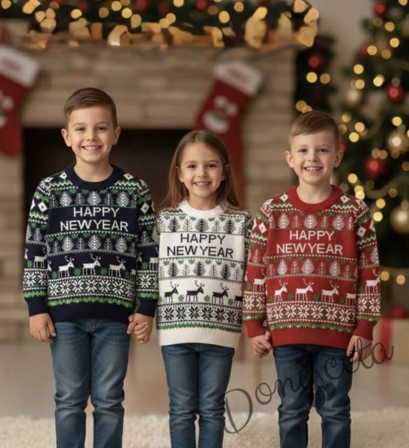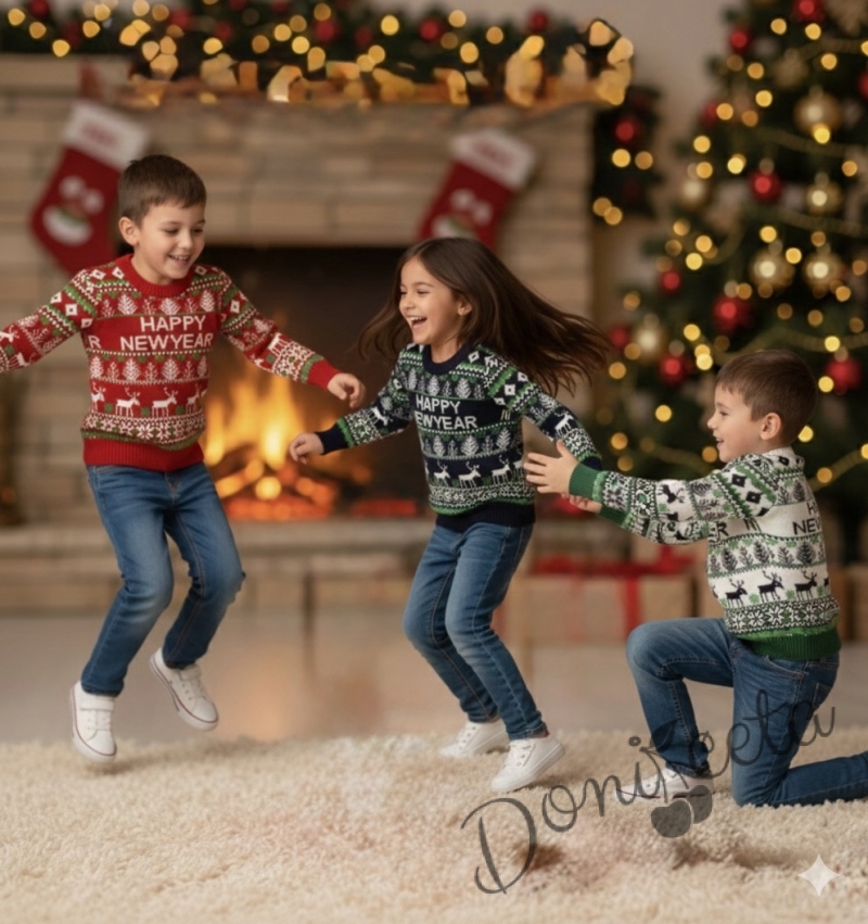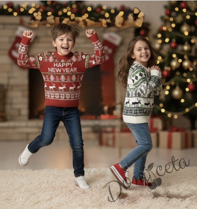 Детски коледен пуловер в червено с коледни мотиви и зелено с еленчета