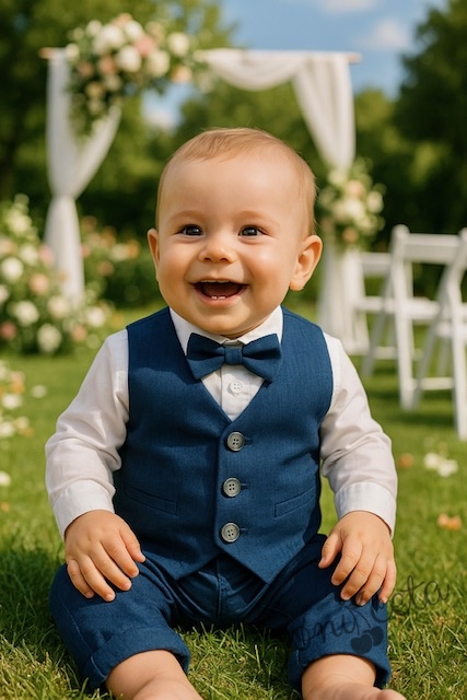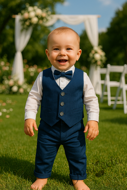 Бебешки официален комплект с елек за момче от 4 части - риза в бяло, панталон, елек и папийонка в тъмносиньо