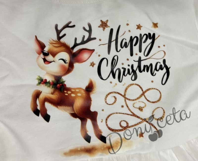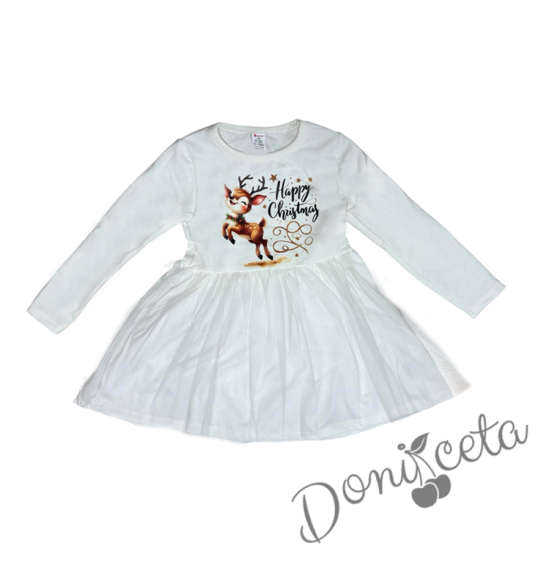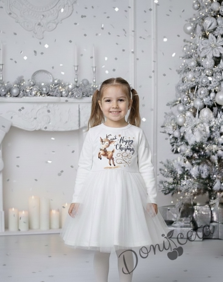 Детска/бебешка коледна рокля с дълъг ръкав в бяло с коледна картинка на еленче с тюл в бяло