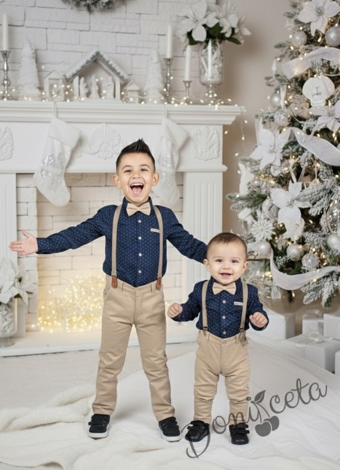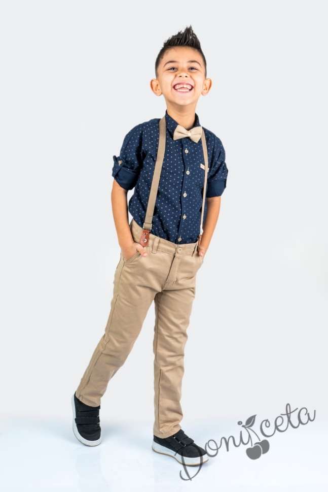 Начало МОМЧЕТА Комплект от риза в тъмносиньо с орнаменти, панталони, тиранти и папийонка в бежово