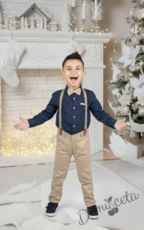 Комплект от риза в тъмносиньо с орнаменти, панталони, тиранти и папийонка в бежово