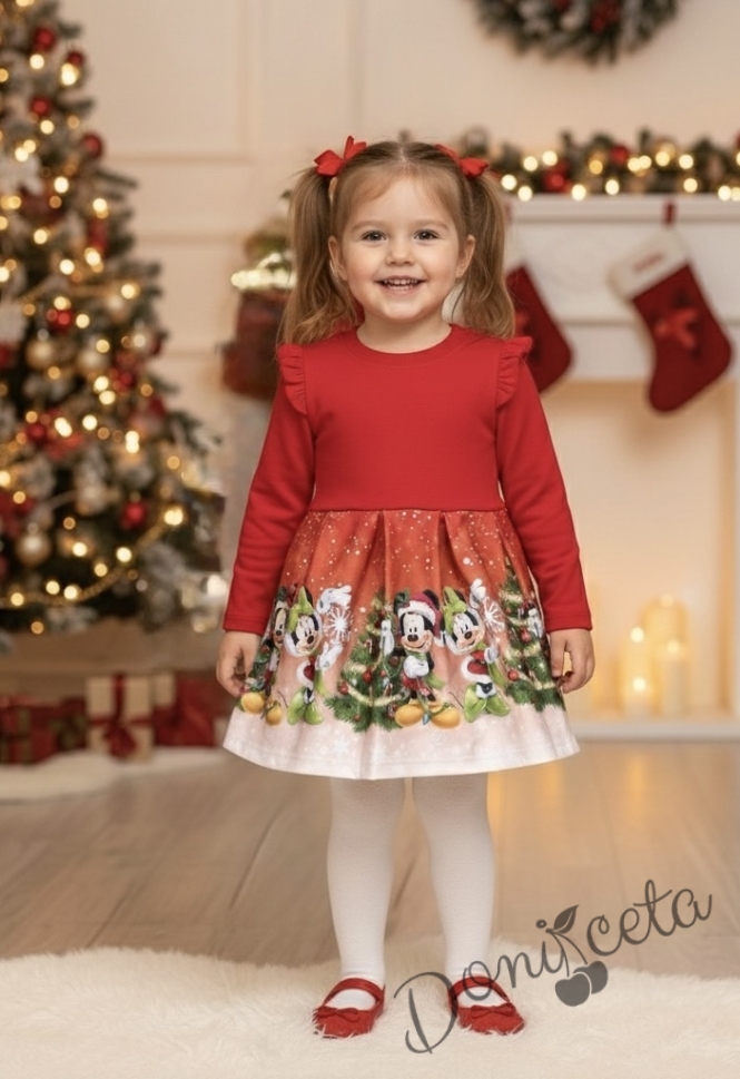 Ватирана коледна рокля с коледна картинка на Мини и Мики Маус за момиче в червено
