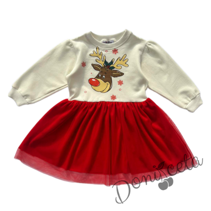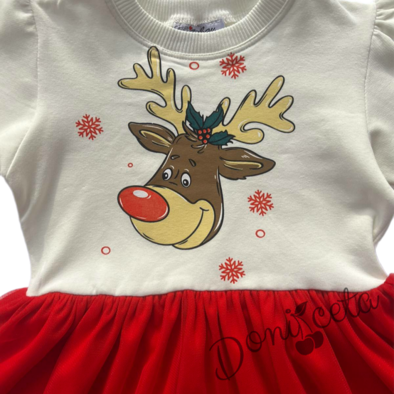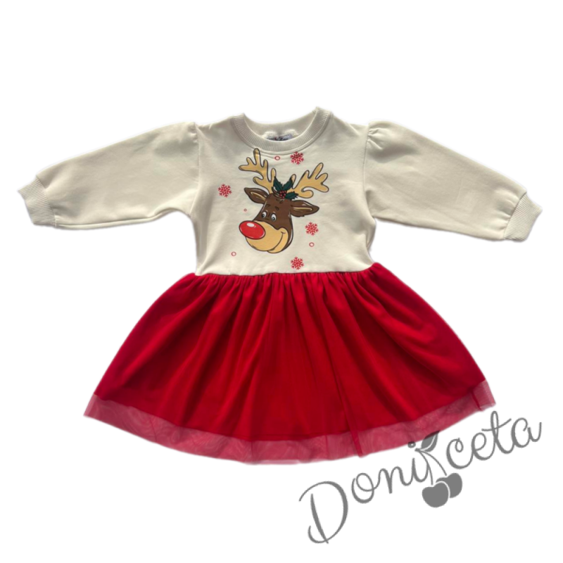 Детска ватирана рокля тип блузка и пола в екрю с картинка на еленче и червен тюл