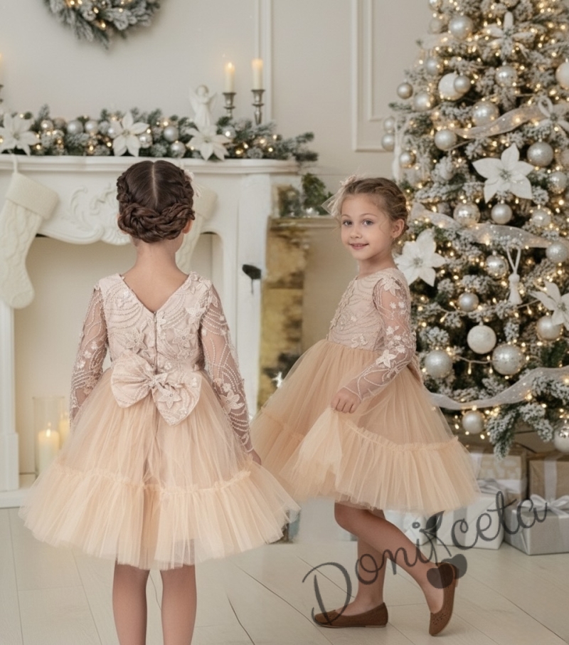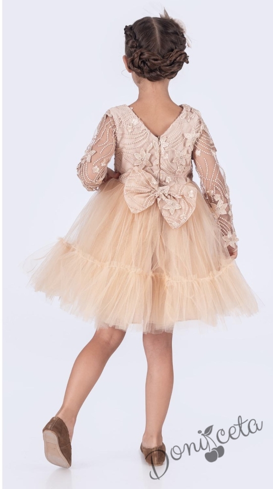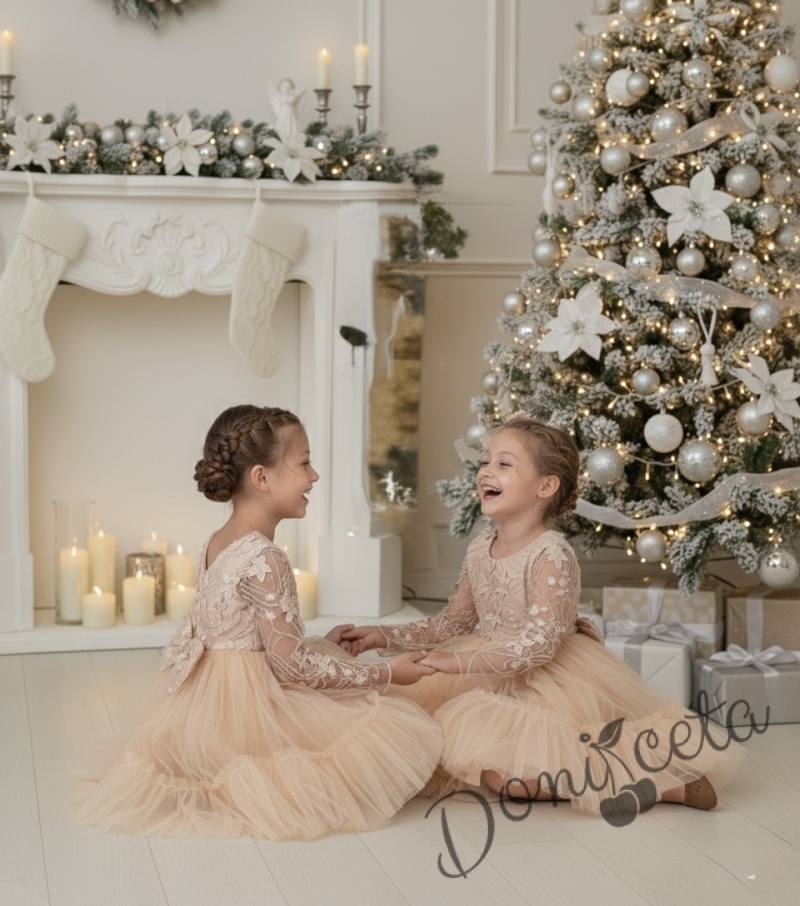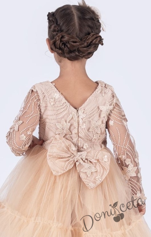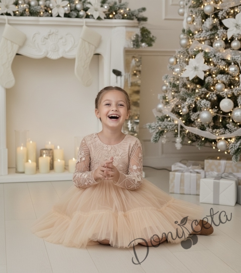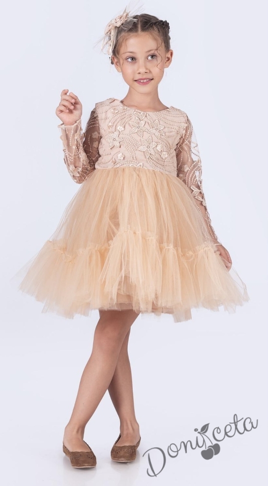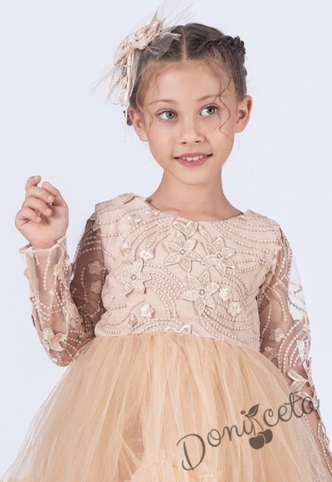 Официална детскарокля с дълъг ръкав Амира с дантела и тюл и фиба за коса в бежово от колекция Бежина