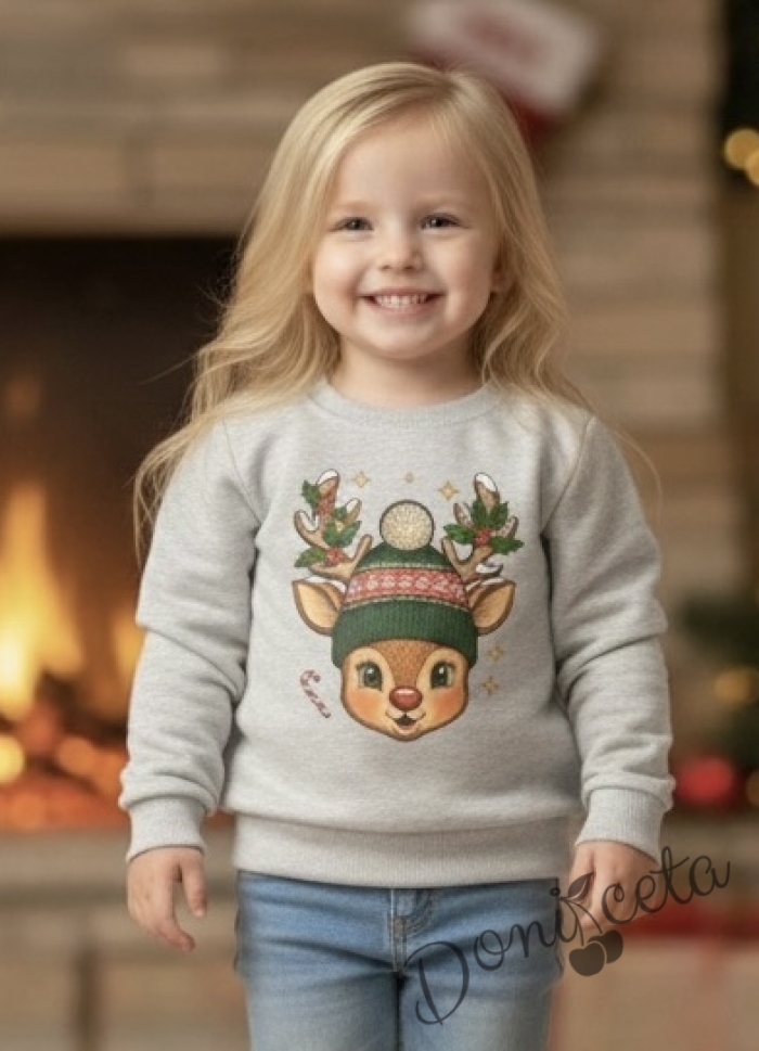 - Весела ватирана коледна и много весела блузка в екрю с елен отпред с рога и шалче.