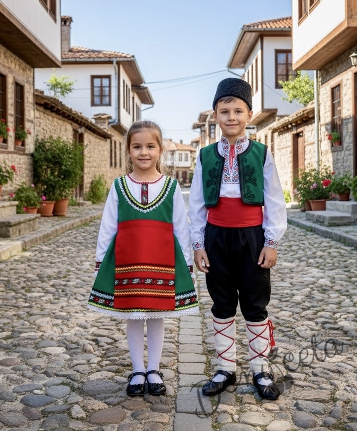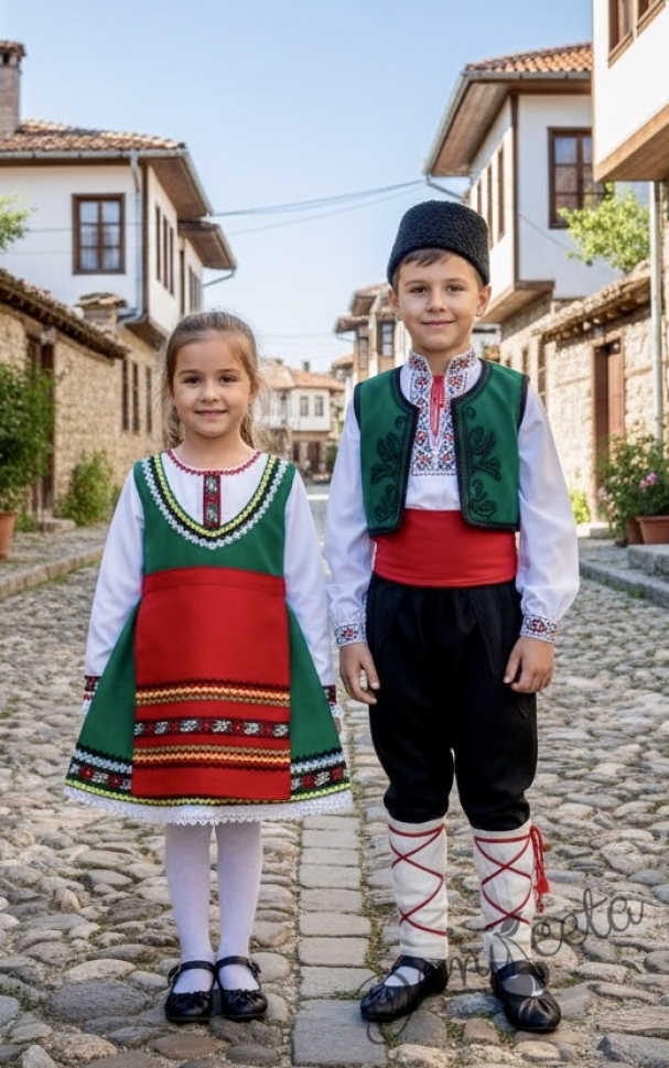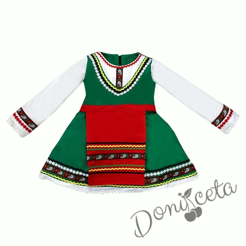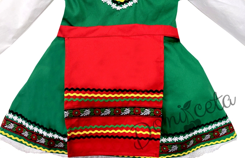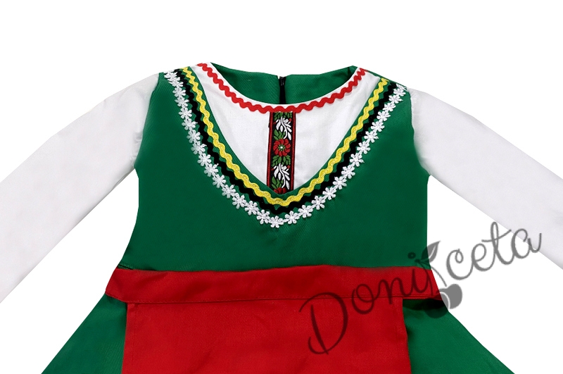 - Красив памучен фолклорен комплект за момиче от сукман в зелено, бели ръкавчета с красив шерит и престилка в червено с етно мотиви.