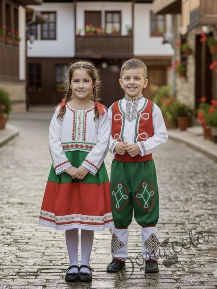 Начало БАБА МАРТА Детска народна носия 72 трибагреник-сукман в бяло, зелено и червено с фолклорни мотиви етно