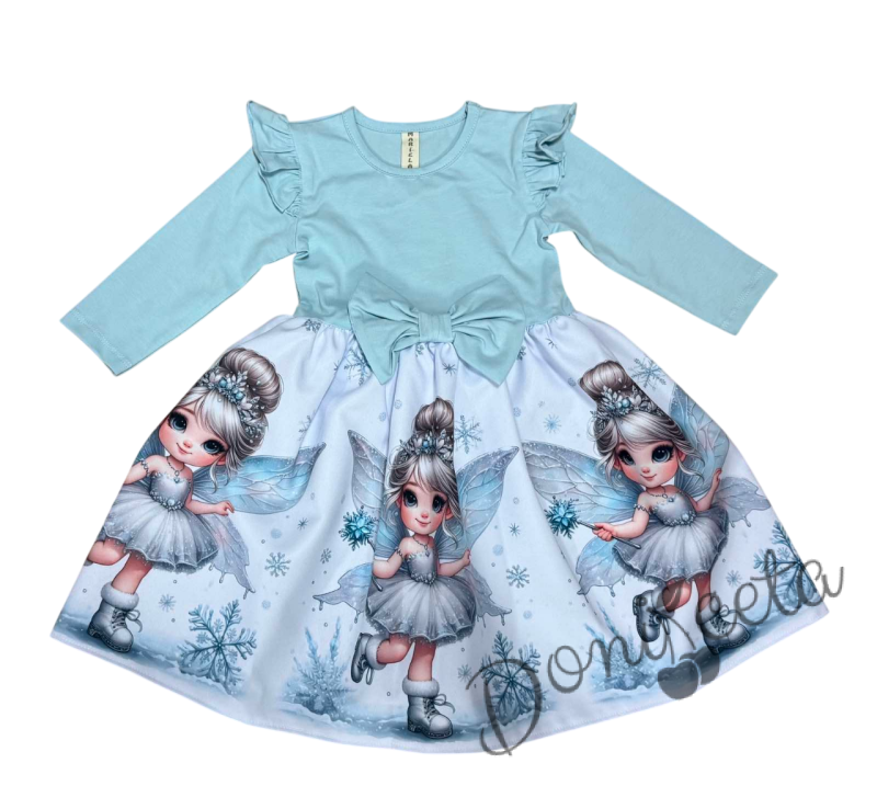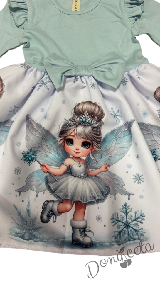 Бебешка/детска коледна рокля в тюркоаз с къдрички, панделка и коледни мотиви