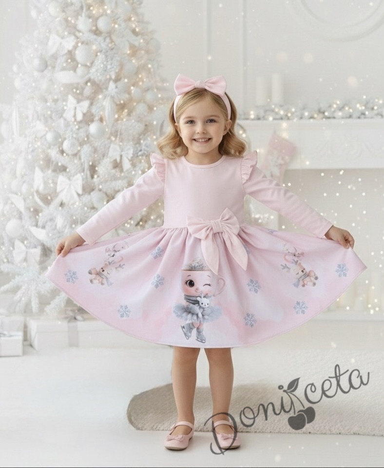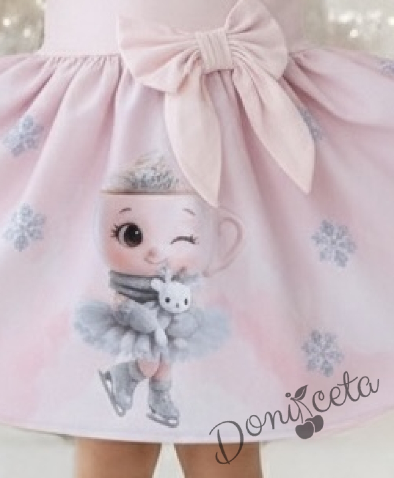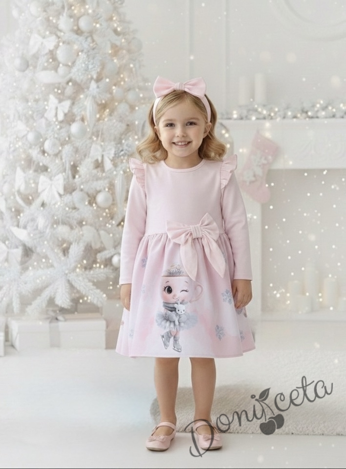 Бебешка/детска коледна рокля в розово с къдрички, панделка и коледни мотиви с балерина