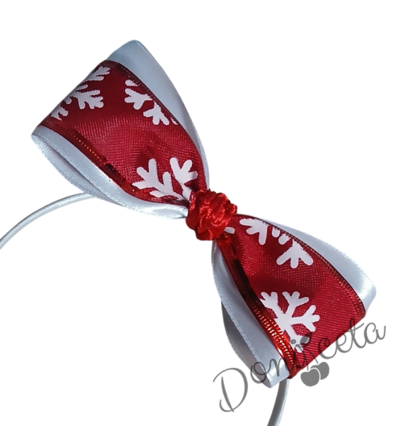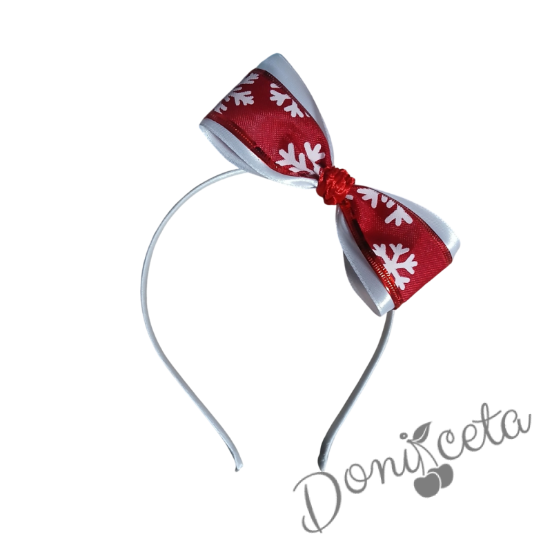 Нежна ръчно изработена диадема, която прекрасно се съчетава с червена коледна рокля. Диадемата е от бяла и червена панделка.