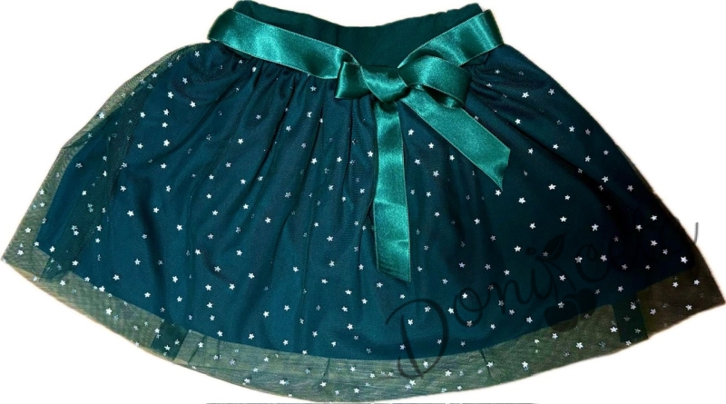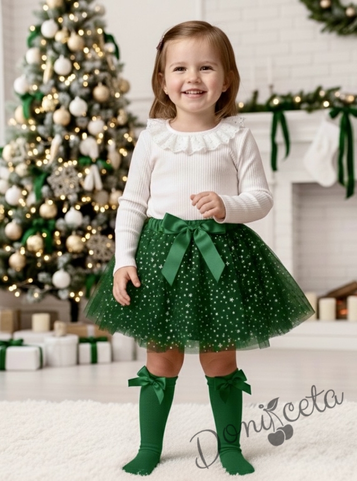 Комплект за момиче от 2 части-пола от тюл в зелено и блуза с дълъг ръкав в бяло с дантела