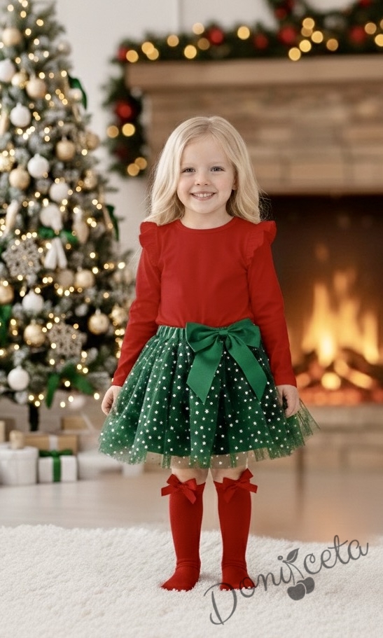 Комплект за момиче от 2 части-пола от тюл в зелено и блуза с дълъг ръкав в червено с крилца