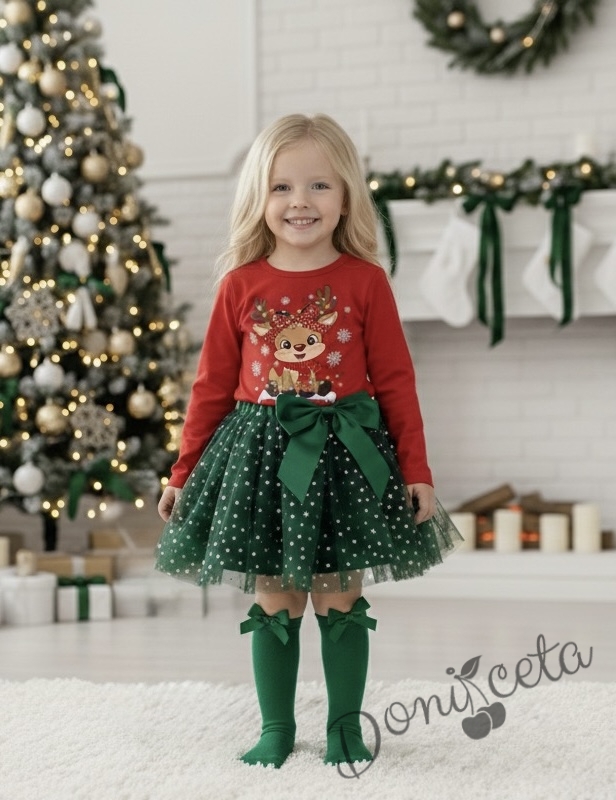 Комплект за момиче от 2 части-пола от тюл в зелено и блуза с дълъг ръкав в червено с картинка