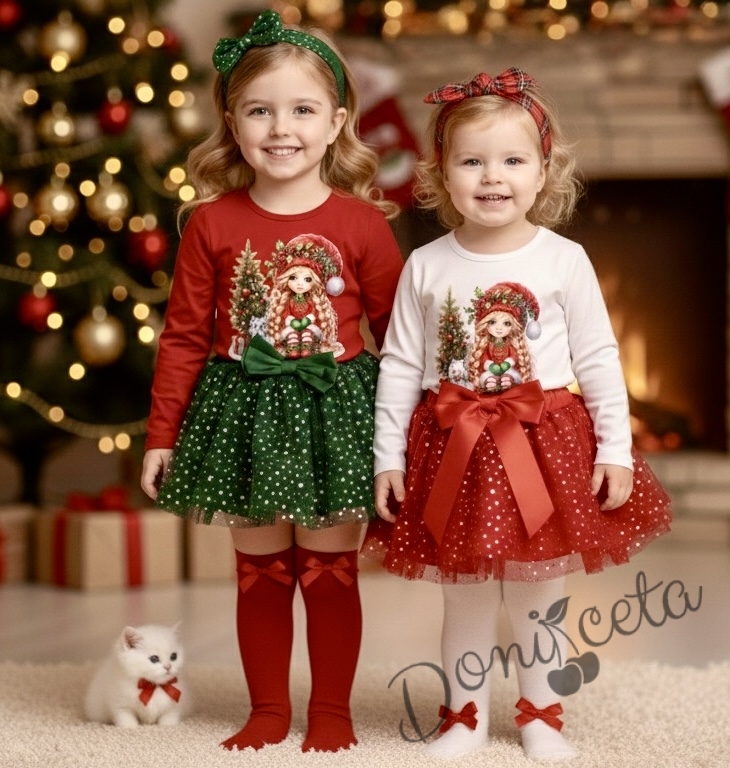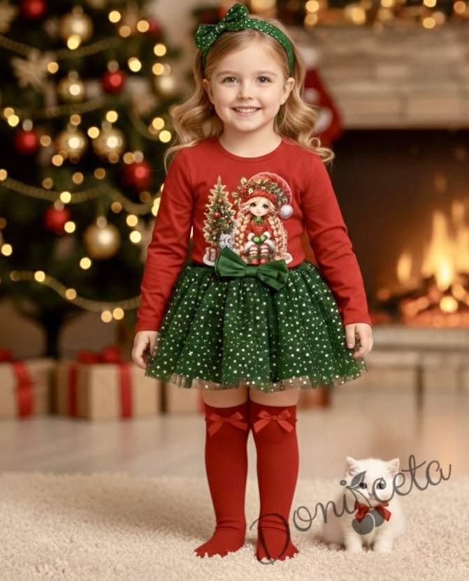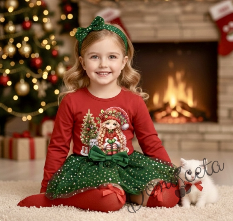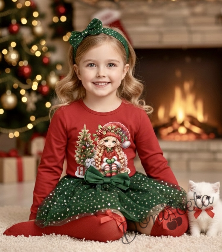Комплект за момиче от 2 части-пола от тюл в зелено и блуза с дълъг ръкав в червено с картинка с момиченце с коте