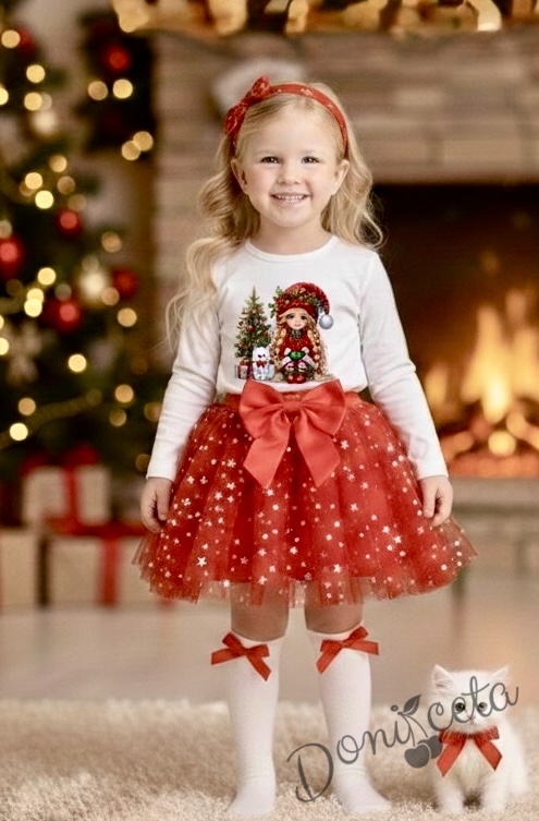 Комплект за момиче от 2 части-пола от тюл в червено и блуза с дълъг ръкав в бяло с картинка с момиченце с коте