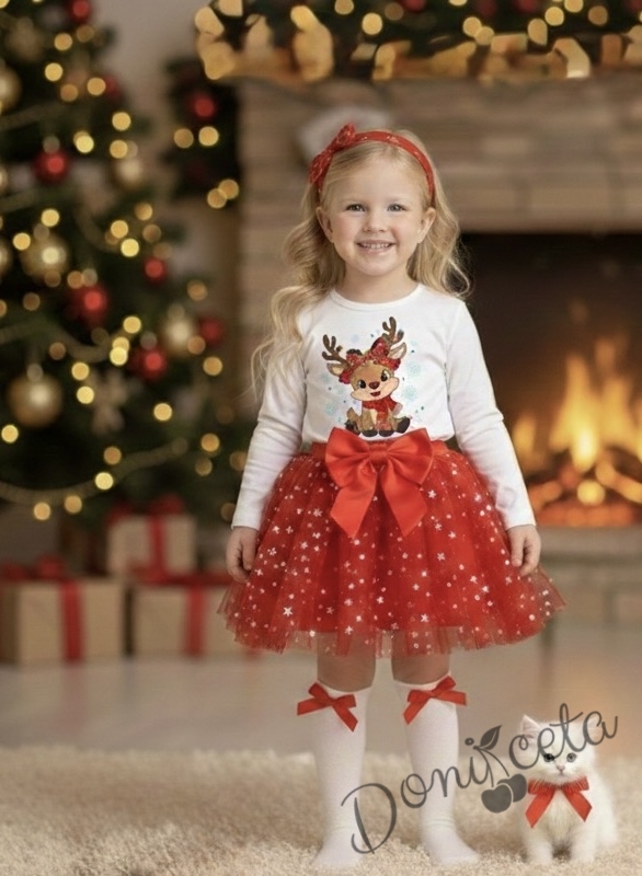 Комплект за момиче от 2 части-пола от тюл в червено и блуза с дълъг ръкав в бяло с картинка с еленче