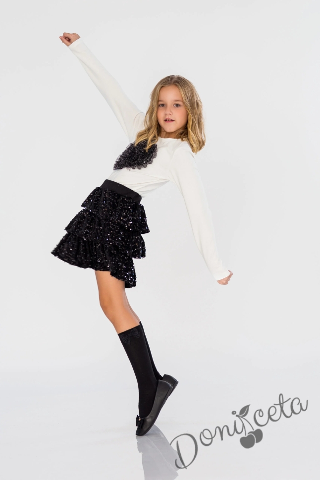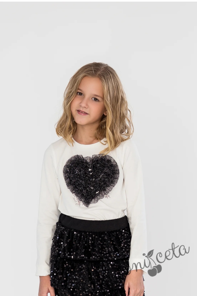 Детска блуза за момиче с дълъг ръкав в екрю със сърце от тюл в черно Contrast