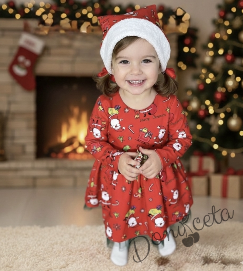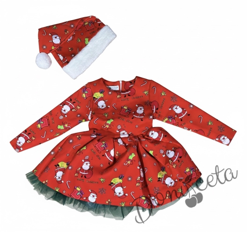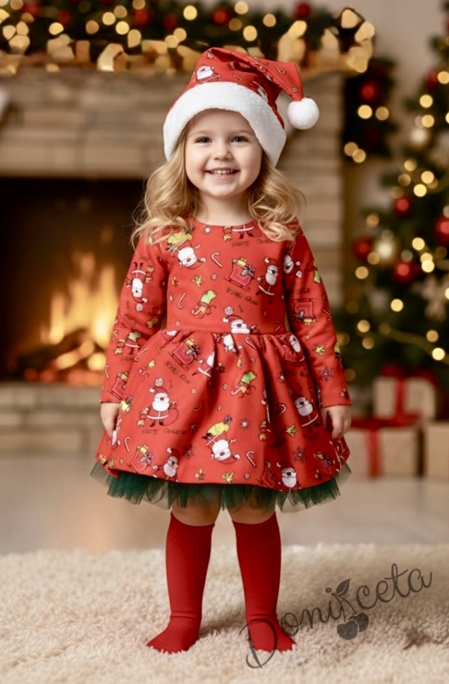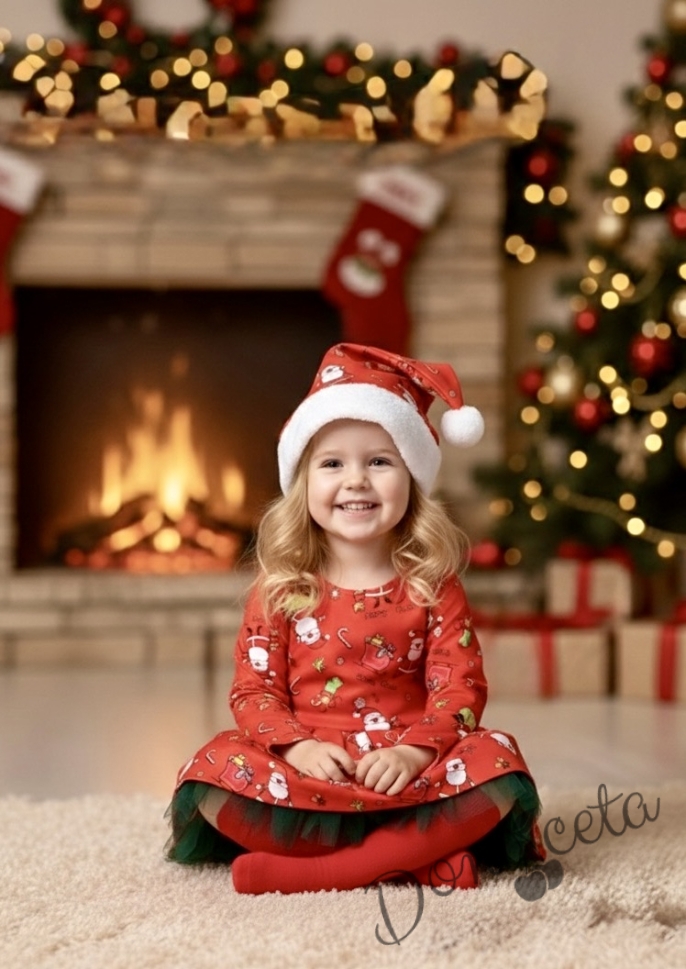 Детска коледна рокля с дълъг ръкав в червено с коледна шапка и зелен тюл отдолу