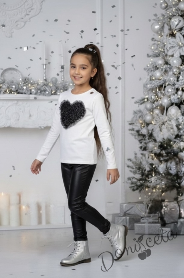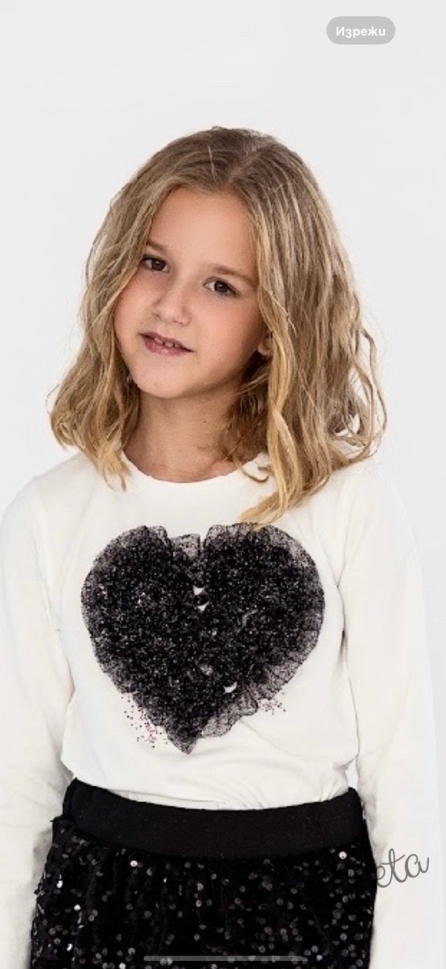 Комплект от много красива детска блуза с дълъг ръкав в екрю със сърце от бляскав тюл и клин с кожа в черно с ръб, с който прекрасно се съчетава.