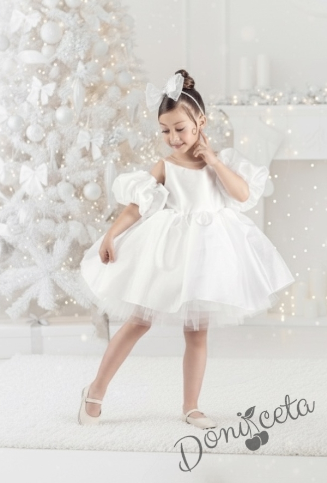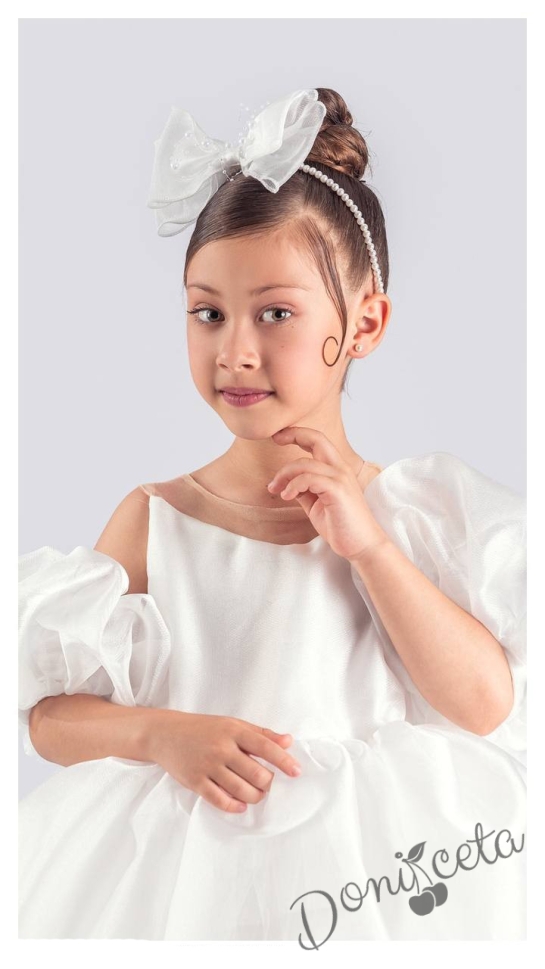 Официална детска рокля с тюл в бяло Даян и панделка за коса за шаферка или кръщене