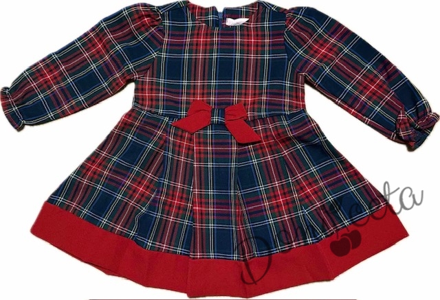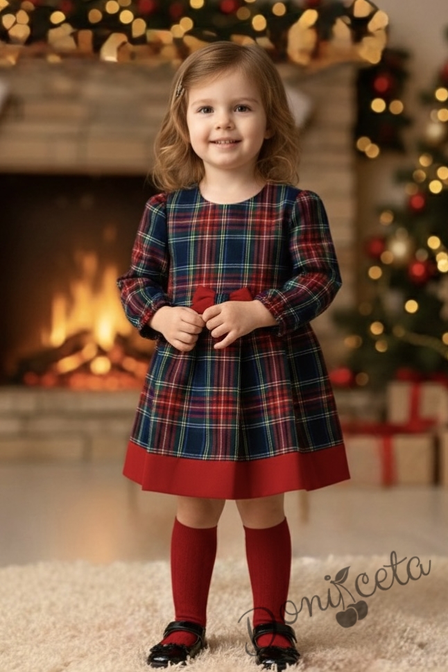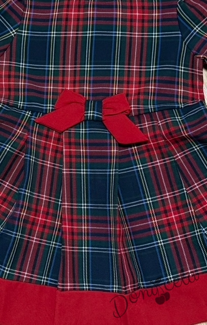 Детска рокля с дълъг ръкав Карена в червено каре с червена лента в долната част и панделка