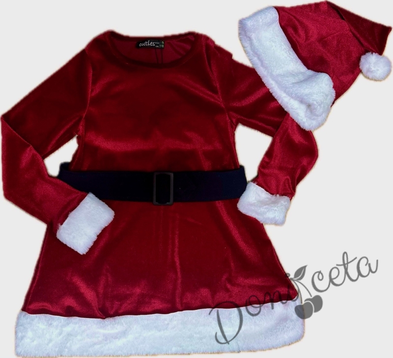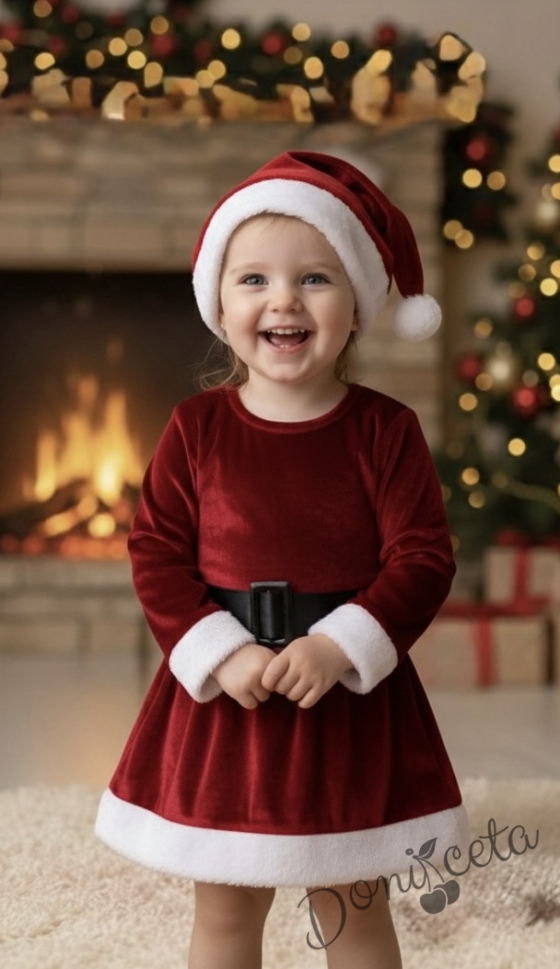Детска коледна плюшена рокля в червено с колан Каролин и коледна шапка