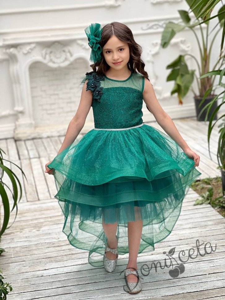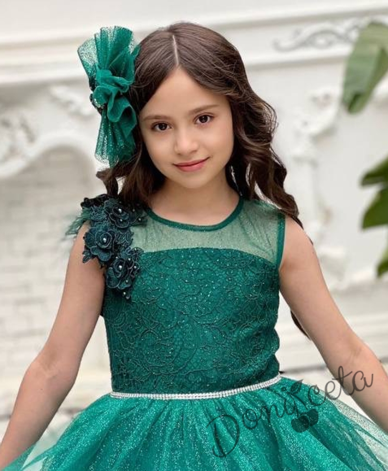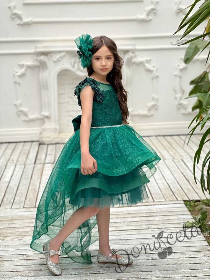 Официална детска рокля в зелено от дантела без ръкав със шлейф Шантал с аксесоар за коса