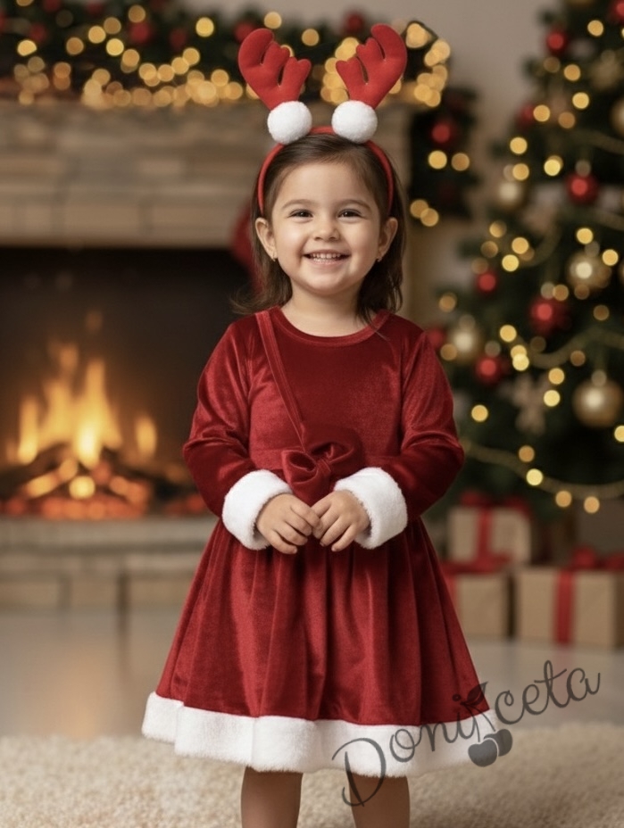 Коледна бебешка/детска рокля в червено с панделка и плюш
