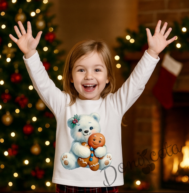 Коледна блуза в бяло с дълъг ръкав и картинка на мече