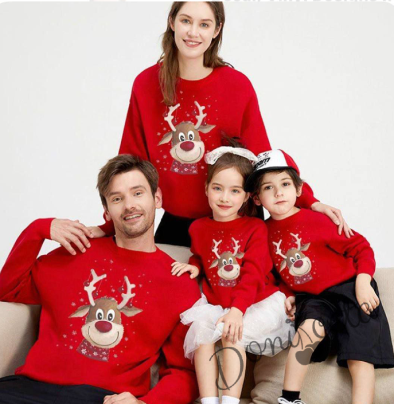 Детска, дамска или мъжка коледна тройно ватирана блуза Звън с еленче с шалче в червено