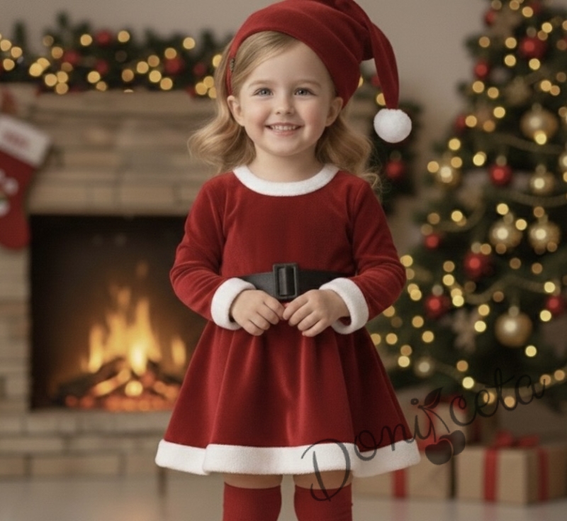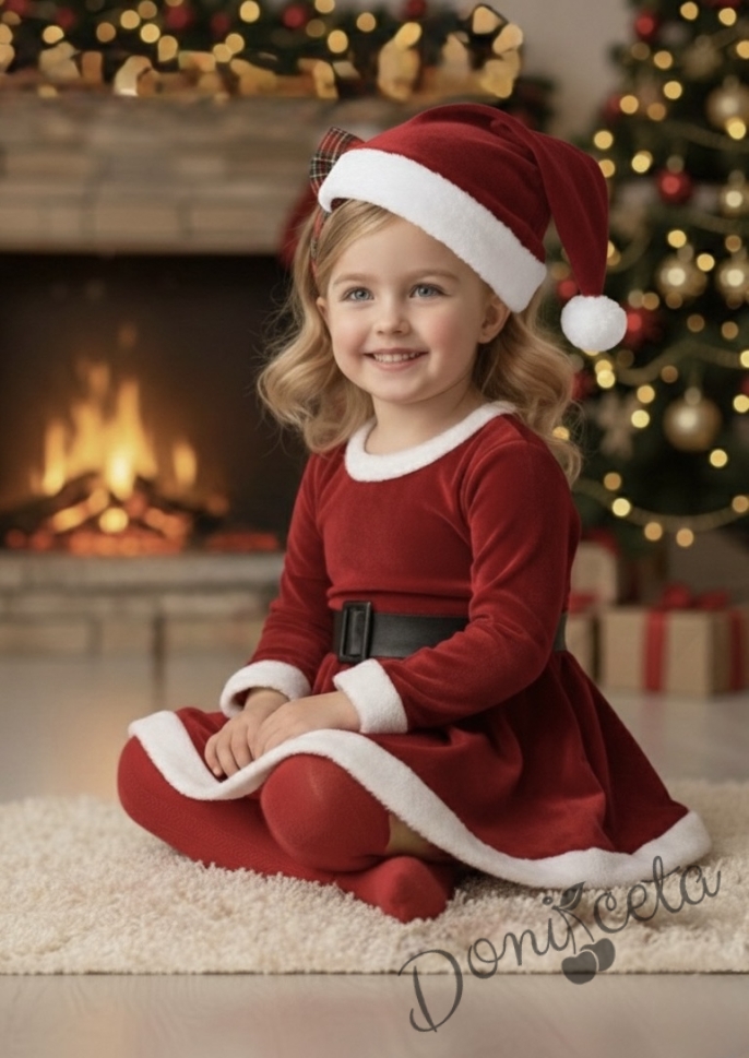Начало МОМИЧЕТА Детска коледна плюшена рокля в червено с колан и коледна шапка