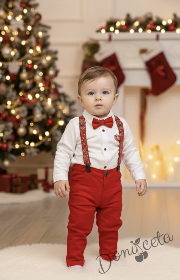 - Много стилен бебешки комплект за момче от ризка в бяло, панталон в червено, тиранти и папийонка.